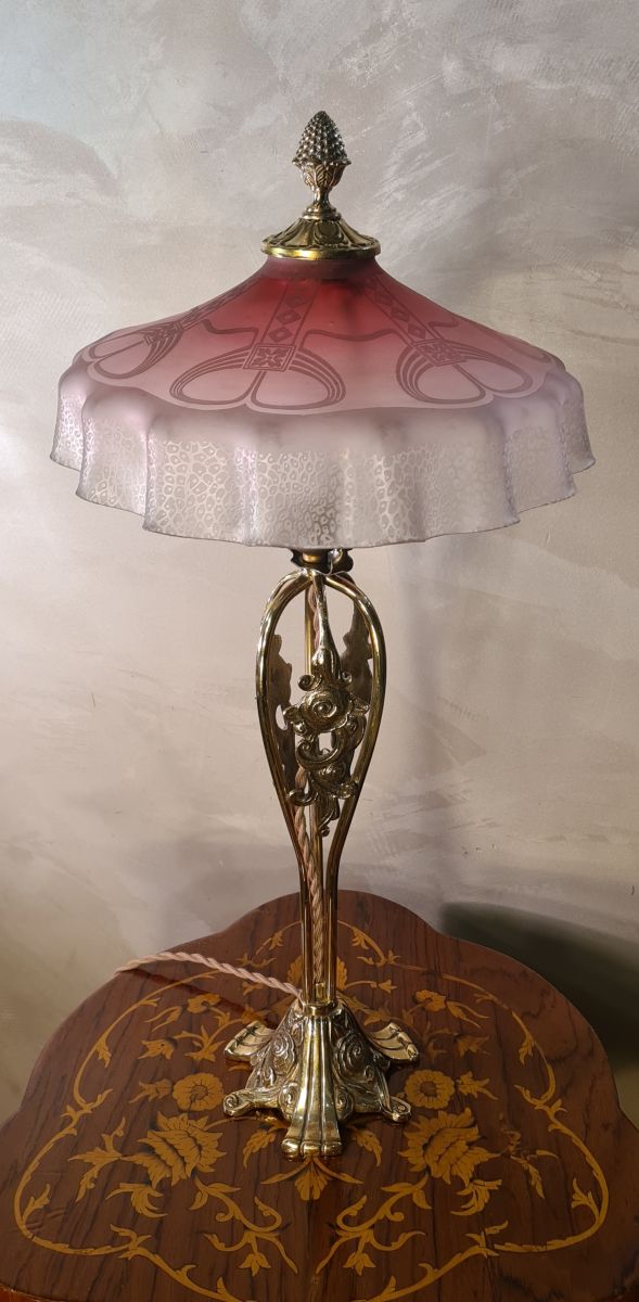 Marque : lampe 1920 bronze abat-jour en verre teinté rose & gravé à l'acide Art Nouveau 63x30 tres rare en superbe etat elec refait a neuf