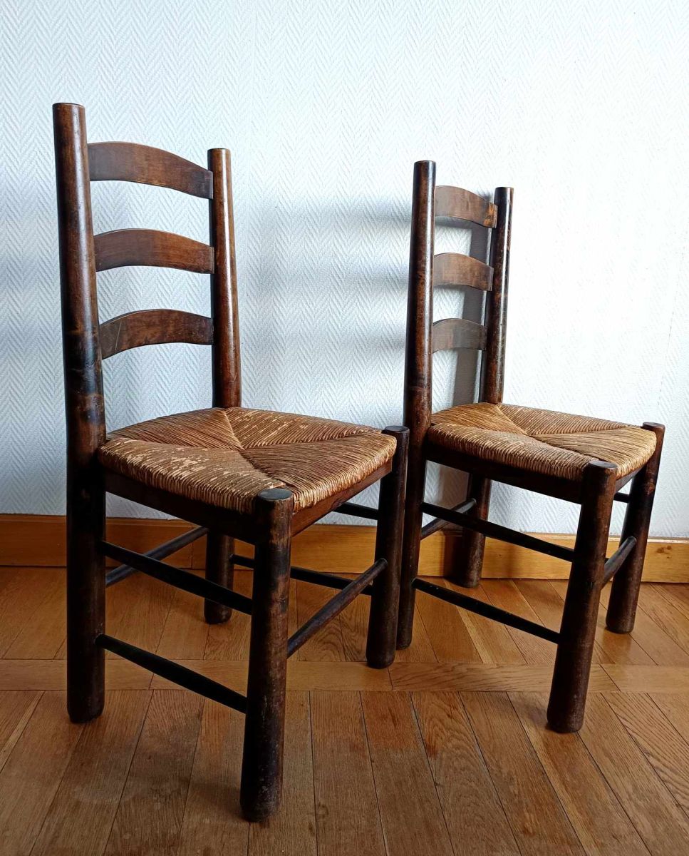 Style chalet rustique dans le goût de Charles Dudouyt ou de Charlotte Perriand, très joli travail des pieds coniques s’élargissant à leur base, en hêtre massif flammé et assises en paille. Modèle authentique avec la paille recouvrant l'intégralité de l'assise, les trois barreaux dorsaux arrondis, et les six entretoises sur le piétement.