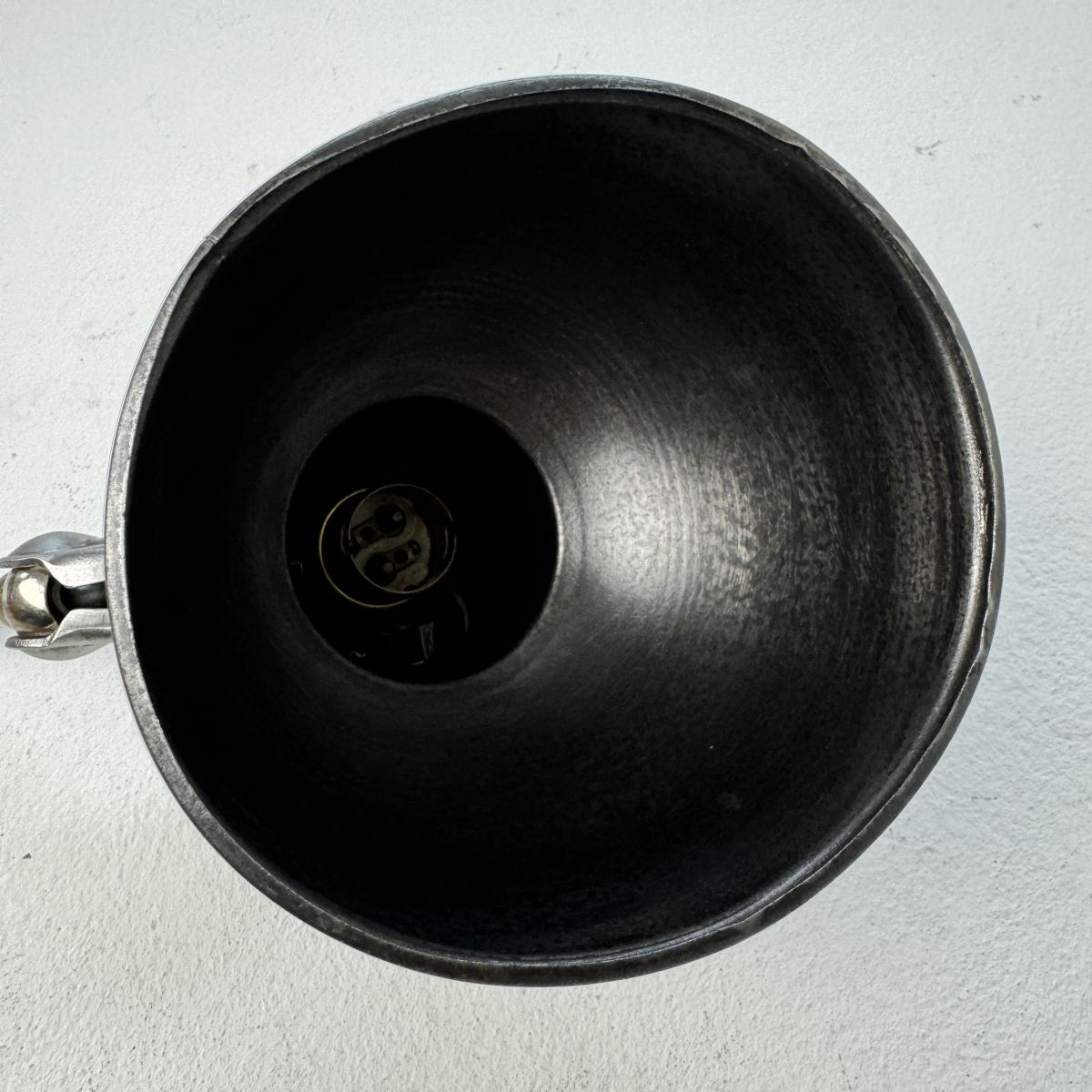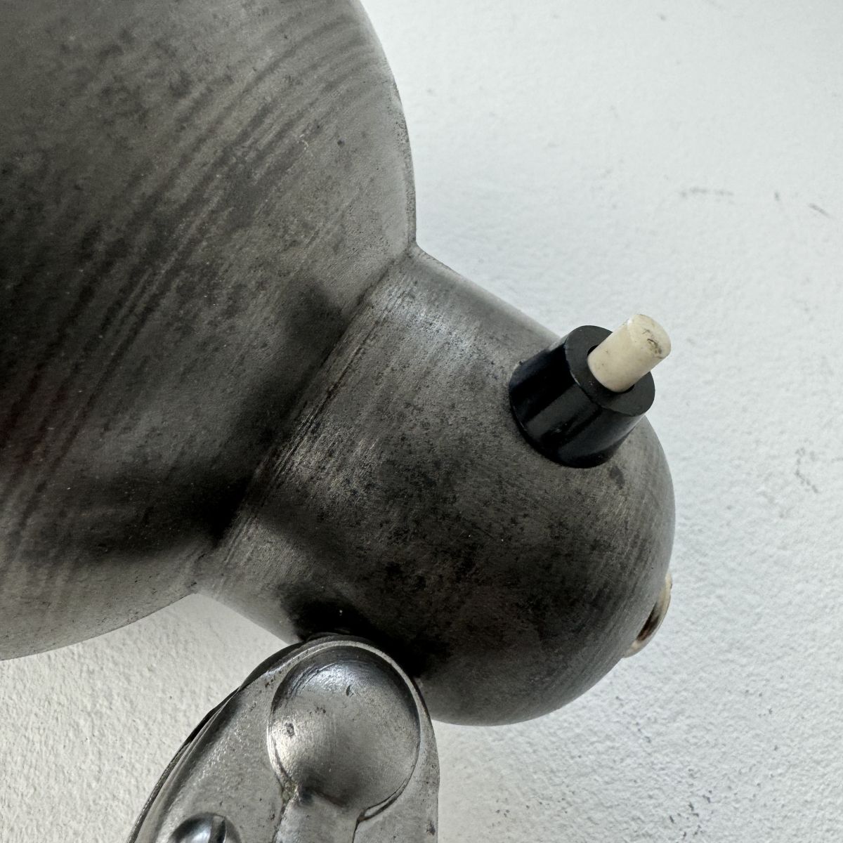 L’abat-jour et la base ont été poncés et patinés ton anthracite Electricité refaite. Interrupteur poussoir sur l’abat-jour. Branchement par domino. Douille à baïonnette en laiton (ampoule B22)