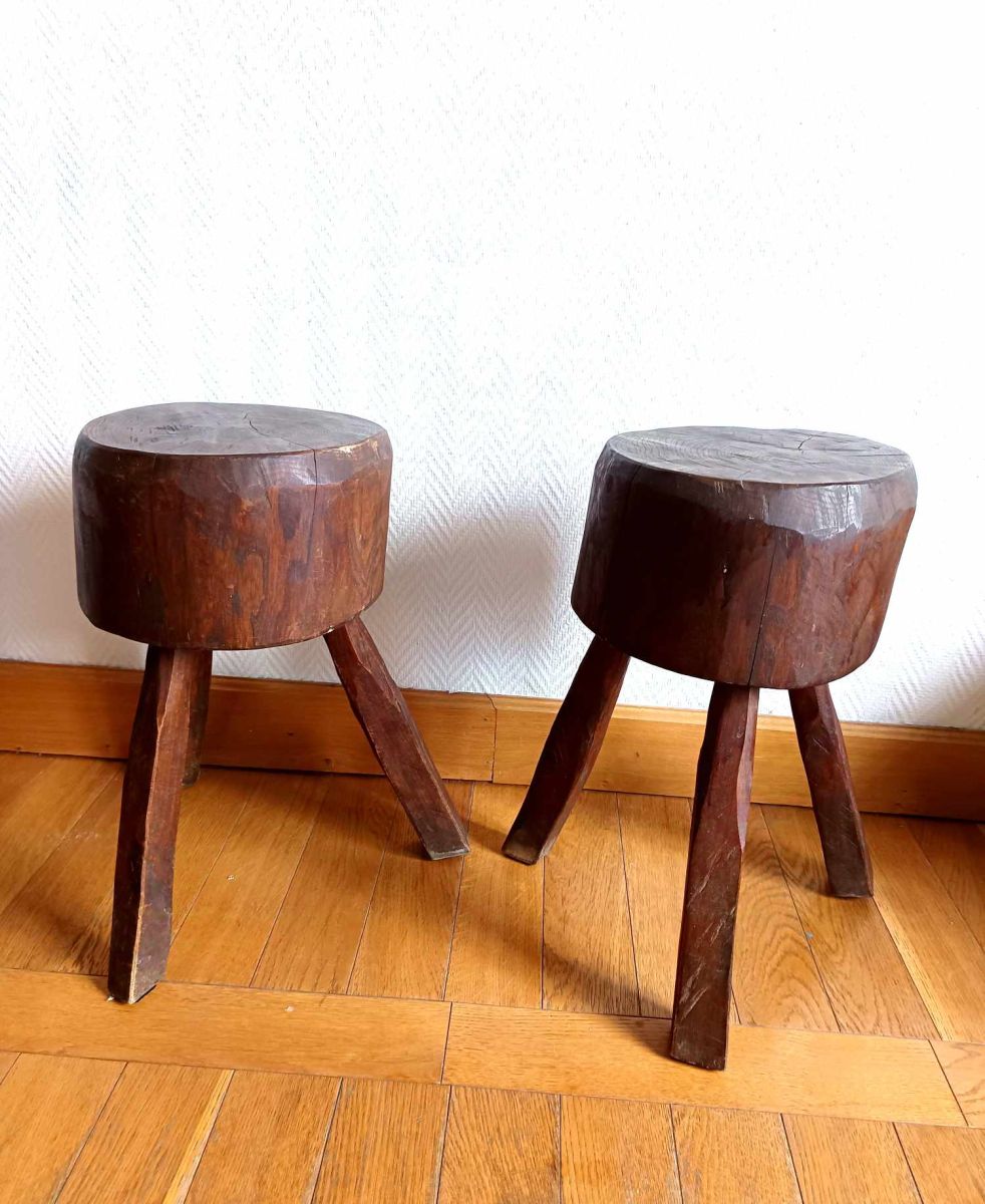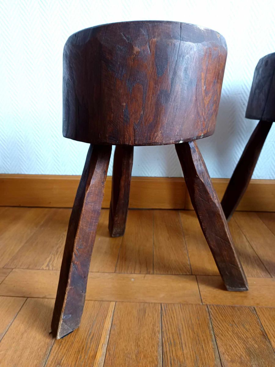 Paire de tabourets en bois massif, travail brutaliste vintage vers 1960. Tabourets tripodes avec épaisse assise circulaire.