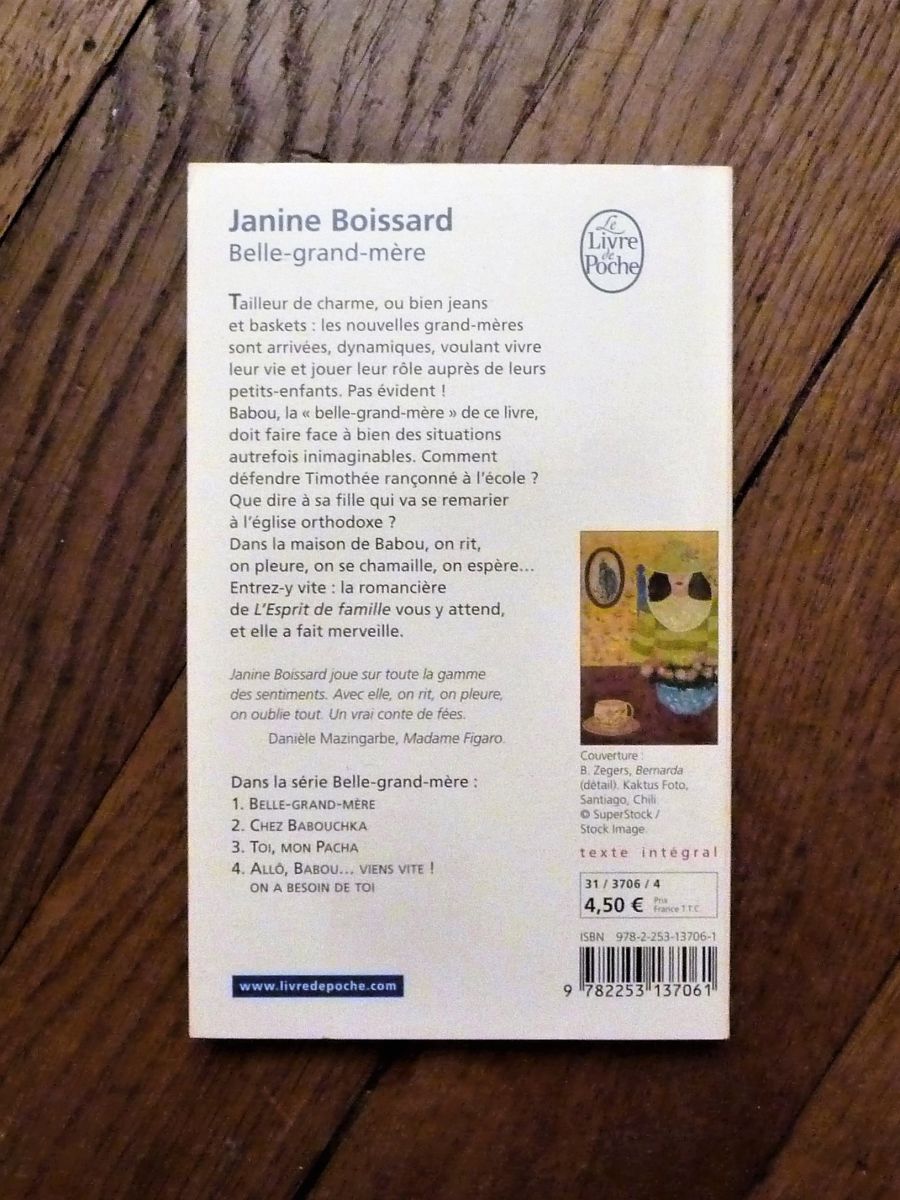 Tailleur de charme, ou bien jeans et baskets: les nouvelles grand mères sont arrivées, dynamiques, voulant vivre leur vie et jouer leur rôle auprès de leurs petits enfants. Pas évident! La famille n'est plus ce qu'elle était, divorces et remariages amènent des nouveaux venus pour qui il faut élargir son coeur. Babou, la "belle grand mère" de ce livre, doit faire face à bien des situations autrefois inimaginables. Comment défendre Timothée rançonné à l'école? Que dire à sa fille qui va se remarier à l'église orthodoxe? Devra t'elle partir elle même pour le Brésil, afin d'en ramener le fils brouillé avec son père? Dans la maison de Babou, on rit, on pleure, on se chamaille, on espère et on s'exaspère, mais surtout on s'y sent bien. Entrez y vite: la romancière de L'Esprit de famille vous y attend, et elle a fait merveille. Janine Boissard joue sur toute la gamme des sentiments. Avec elle, on rit, on pleure, on oublie tout. Un vrai conte de fées. Danièle Mazingarbe, Madame Figaro.
