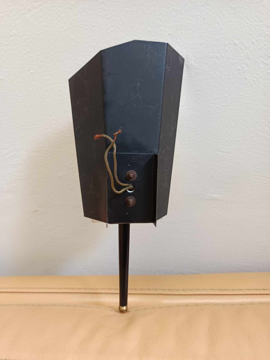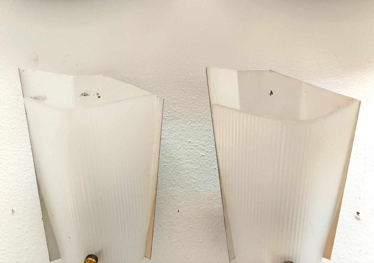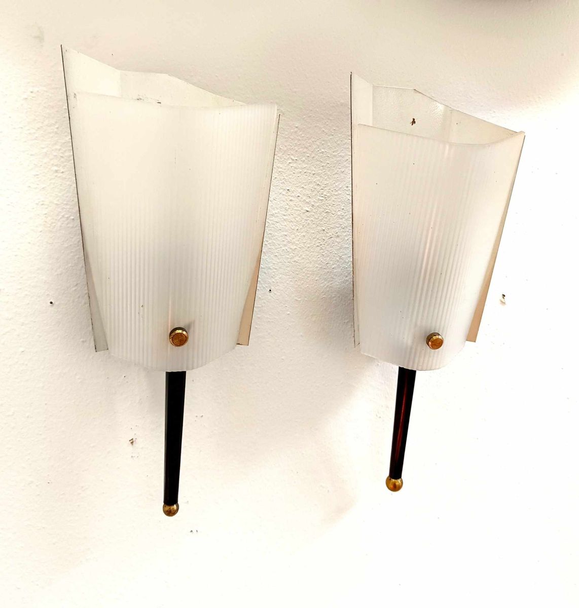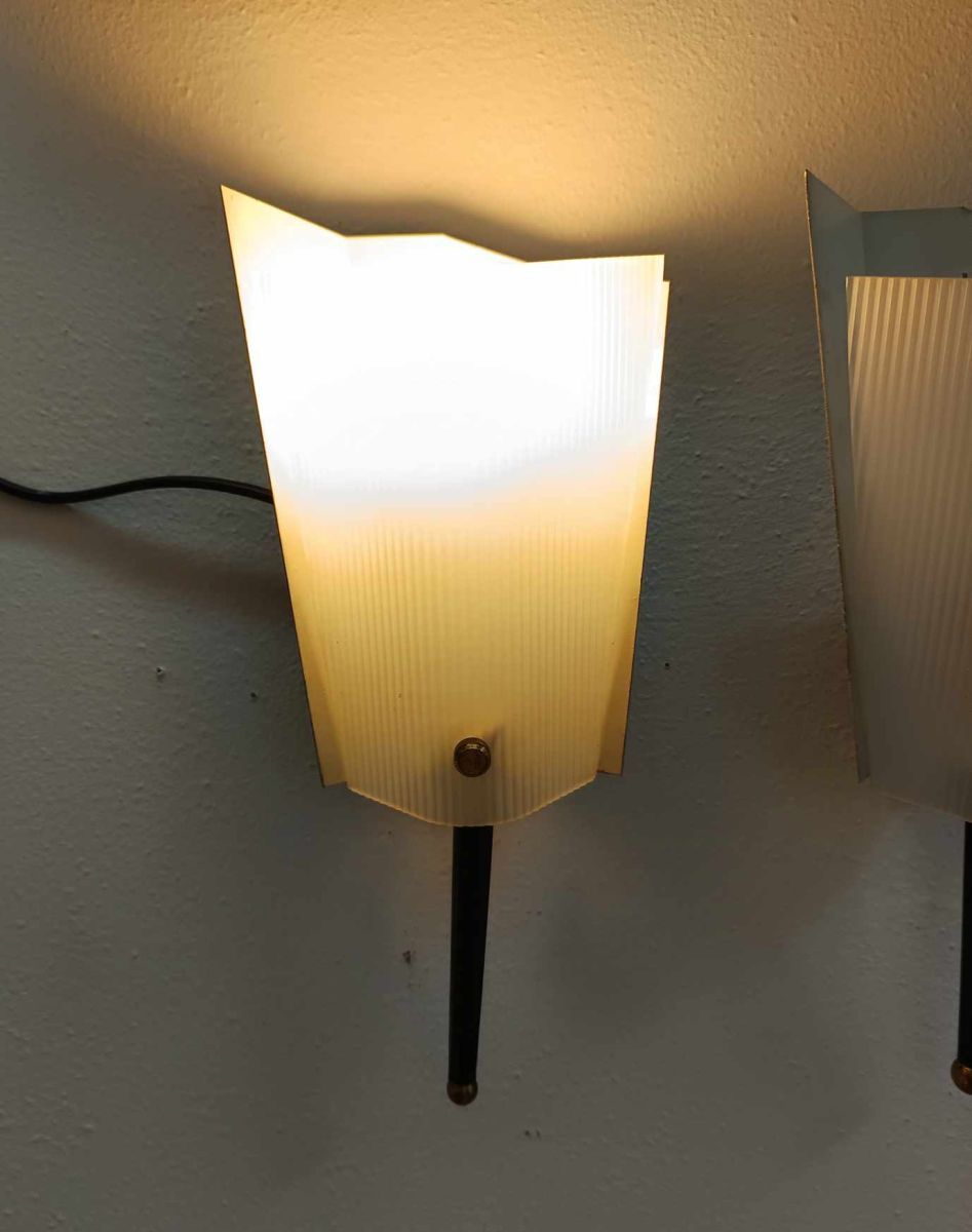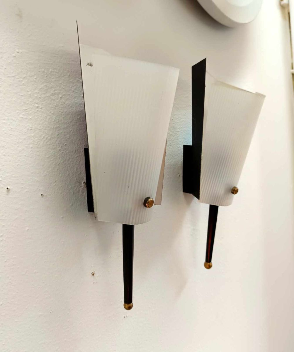 Typique des années 1960, ces appliques reprennent la forme d'un flambeau. Le réflecteur en perpex texturé blanc diffuse de manière homogène une douce lumière.