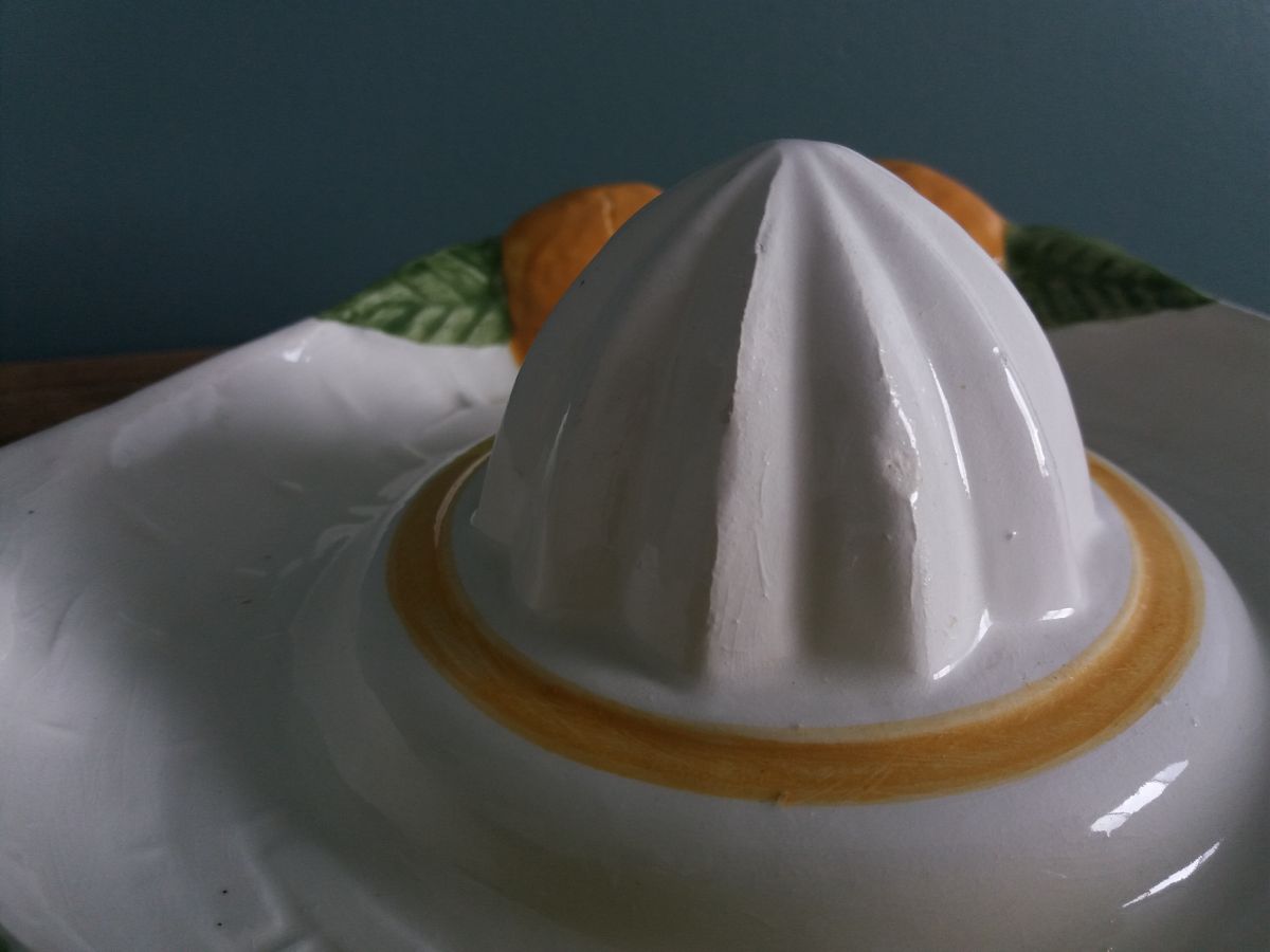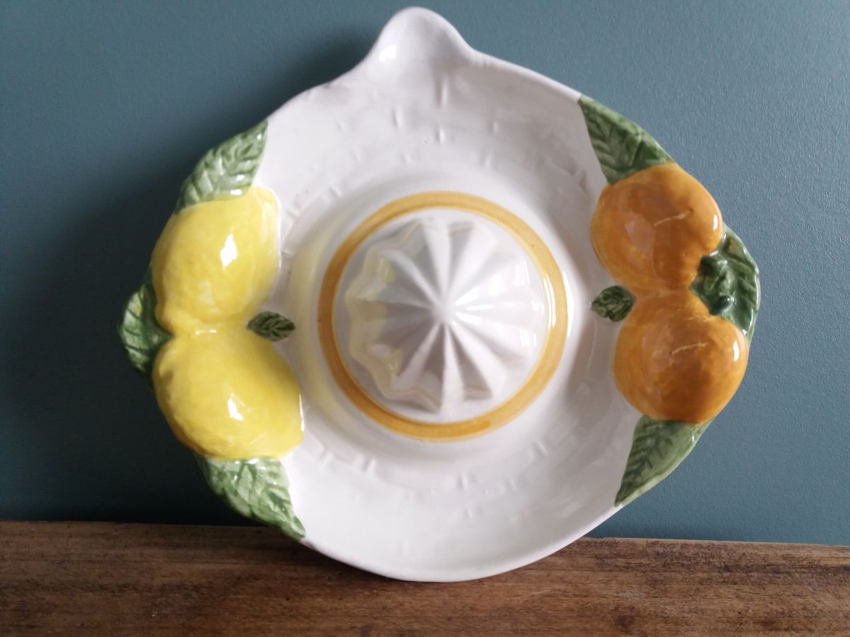 Joli presse agrume en barbotine, avec un décor très frais, très pimpant d’oranges et de citrons, de quoi mettre une touche de gaîté sur la table du petit déjeuner.