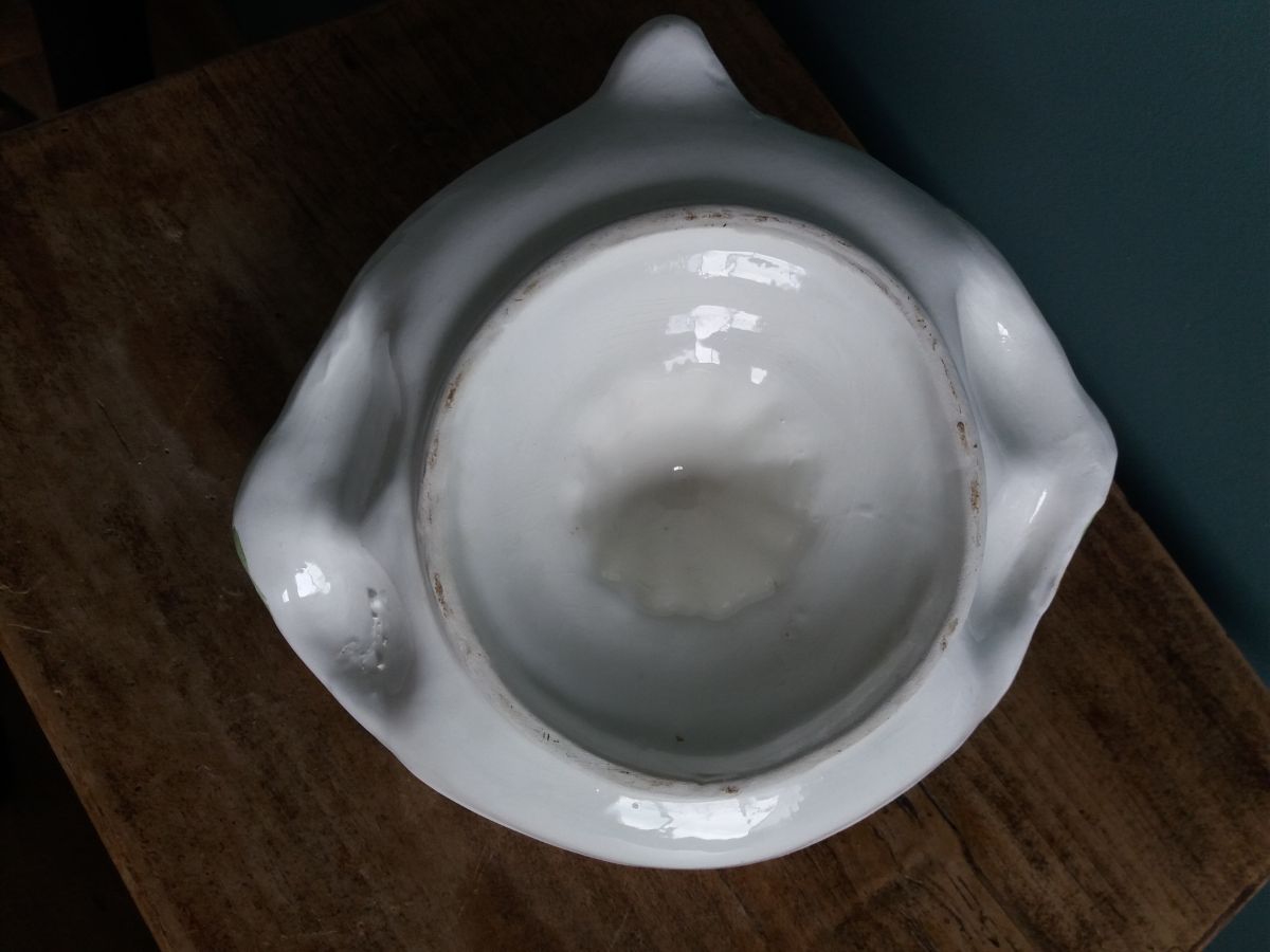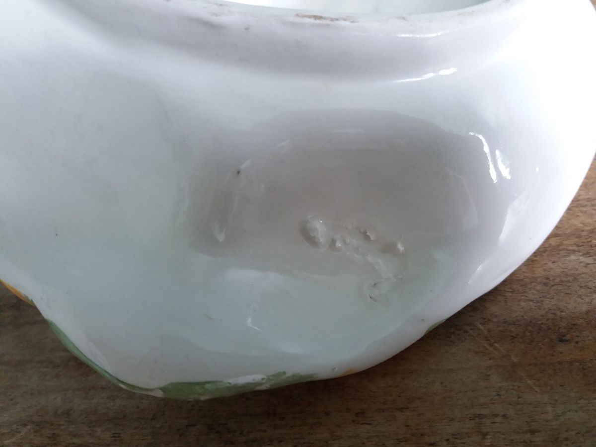 Il est en bon état, pas de fêle, mais comporte quelques légères marques d’usage qui témoignent de son âge : une petite égrenure sur l’émaillage blanc de la partie centrale et trois ou quatre égrenures sur l’émaillage coloré, si petites et situées sur le bord du presse-agrume, elles sont quasiment invisibles.