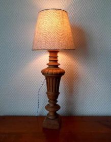 Lampe brutaliste en bois des années 60, abat-jour en laine marron foncé, fil d’origine en tissu en excellent état, ampoule baïonnette, hauteur 70cm, piétement 44cm, bon état.
