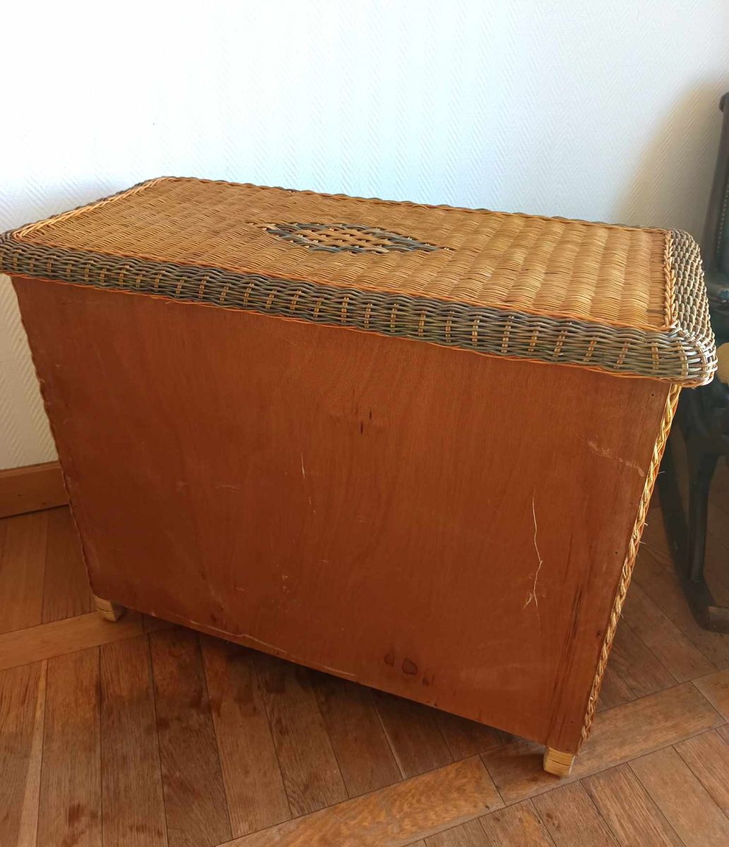 En très bon état, aucun manque au rotin, belle couleur miel, travail de formes géométriques bicolores.