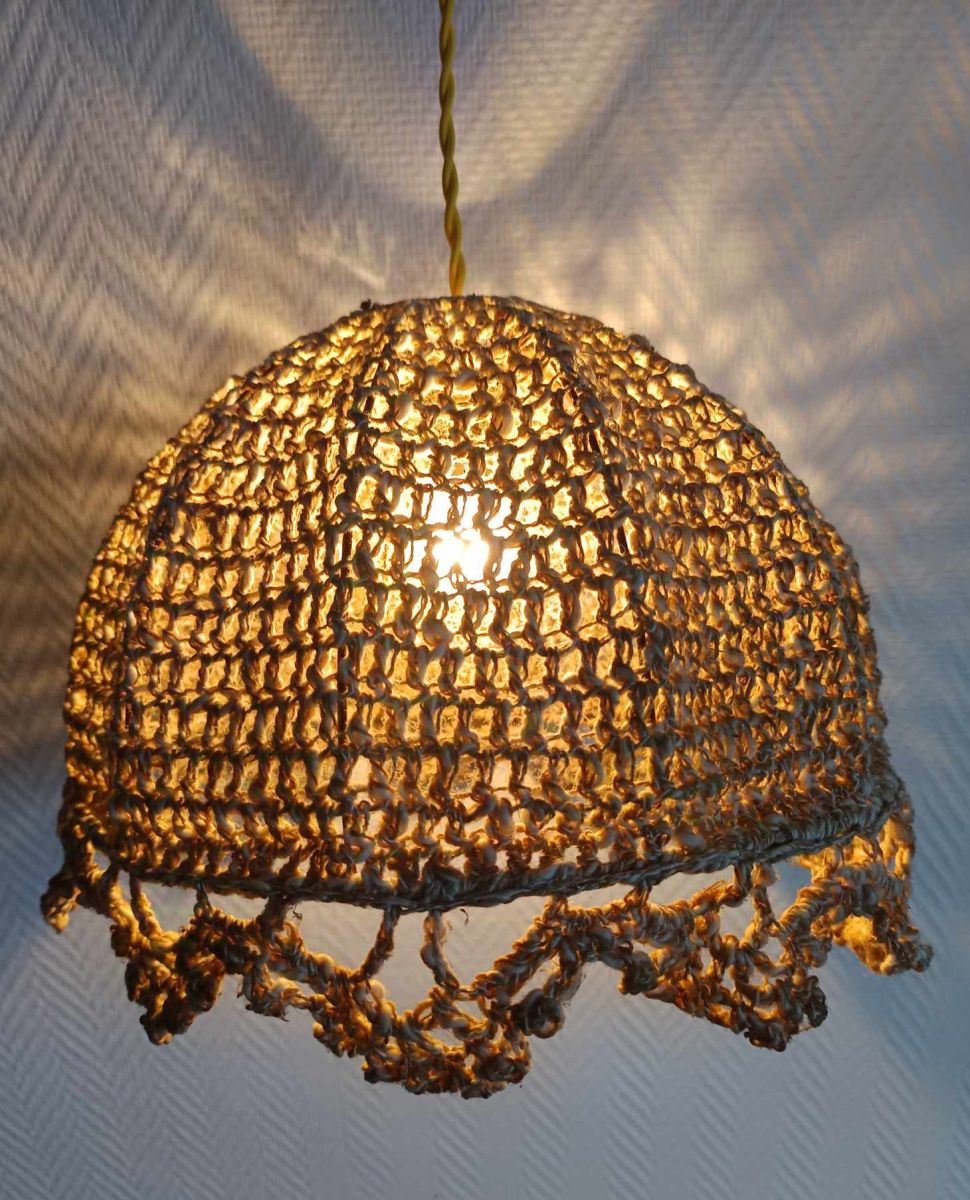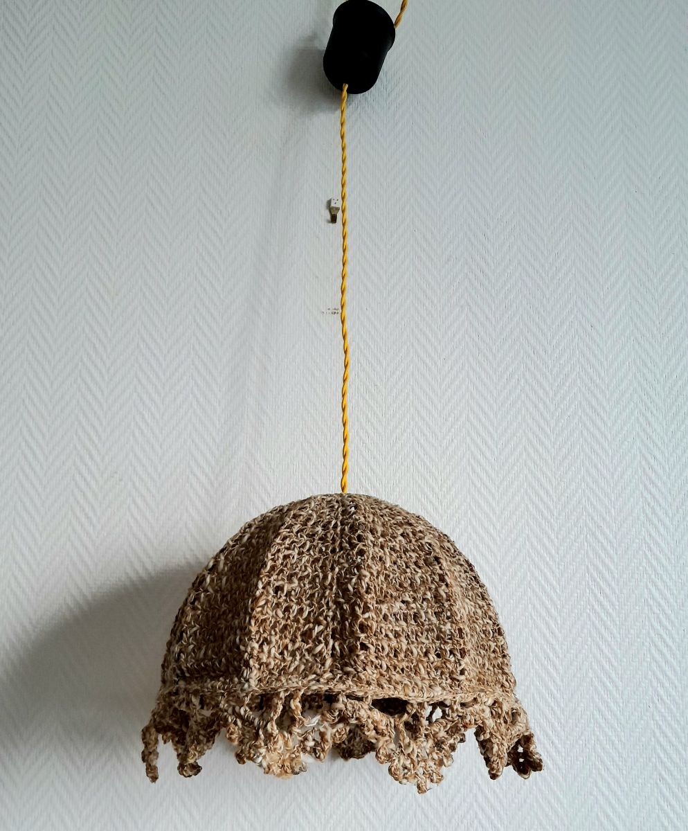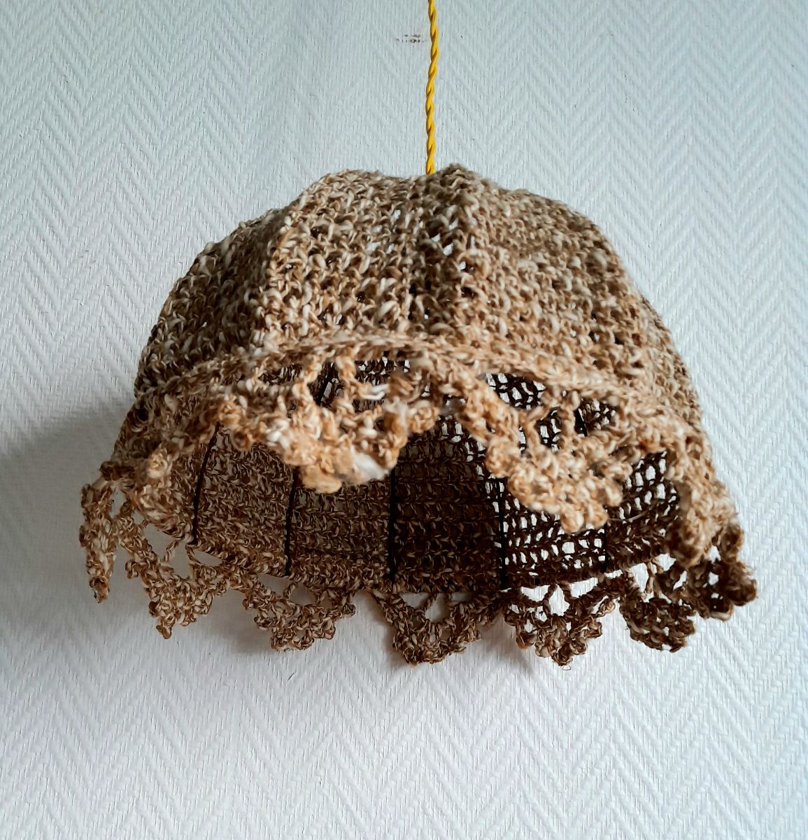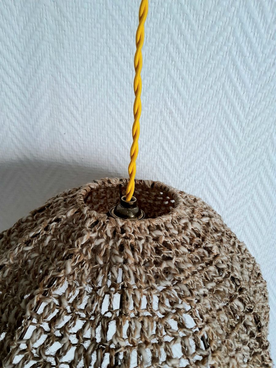 Suspension vintage vers 1970 faite en crochet de laine de couleur taupe. Fil électrique en tissu torsadé jaune, électrification propre et fonctionnelle (douille en laiton à baïonnettes).