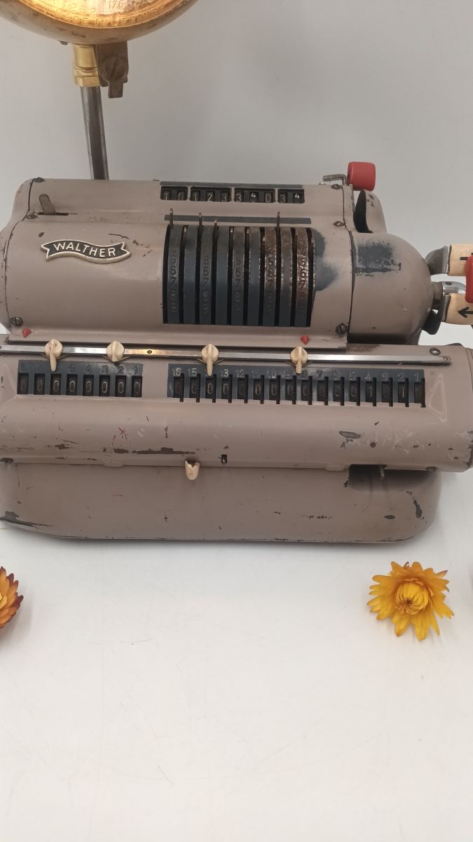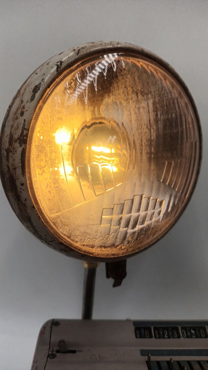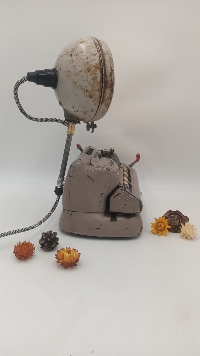 Lampe faite à partir d'une machine à calculer manuelle ancienne et d'un petit phare de tracteur.