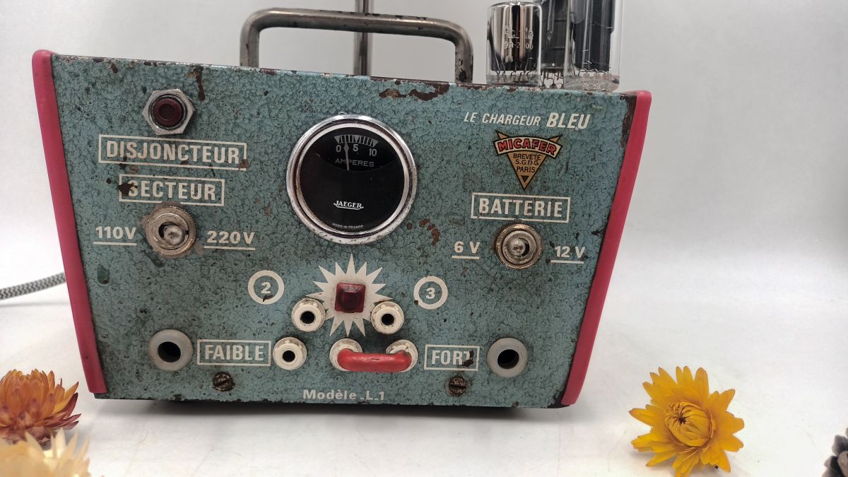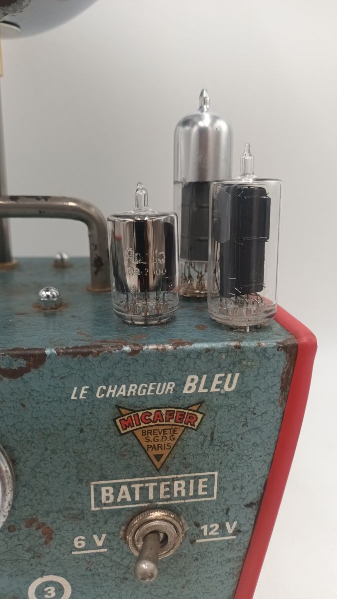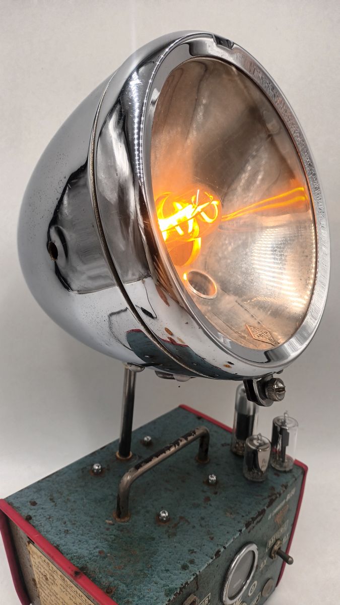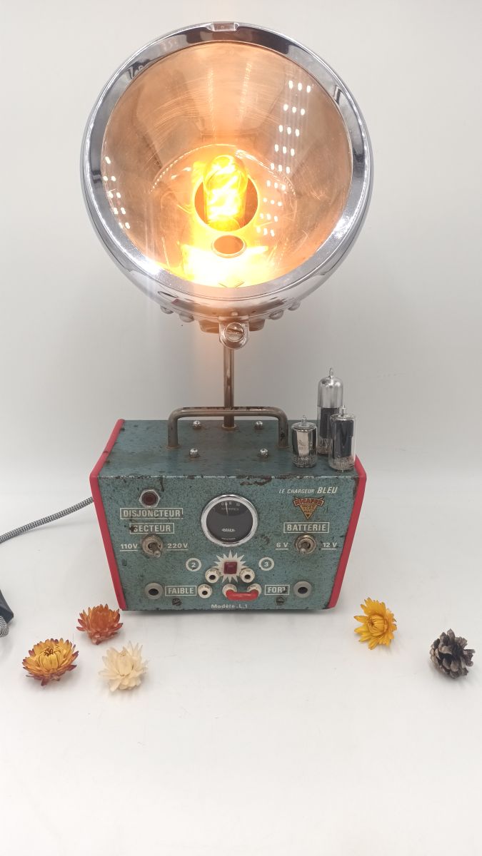 Lampe faite avec un ancien chargeur de batterie et un phare de traction.