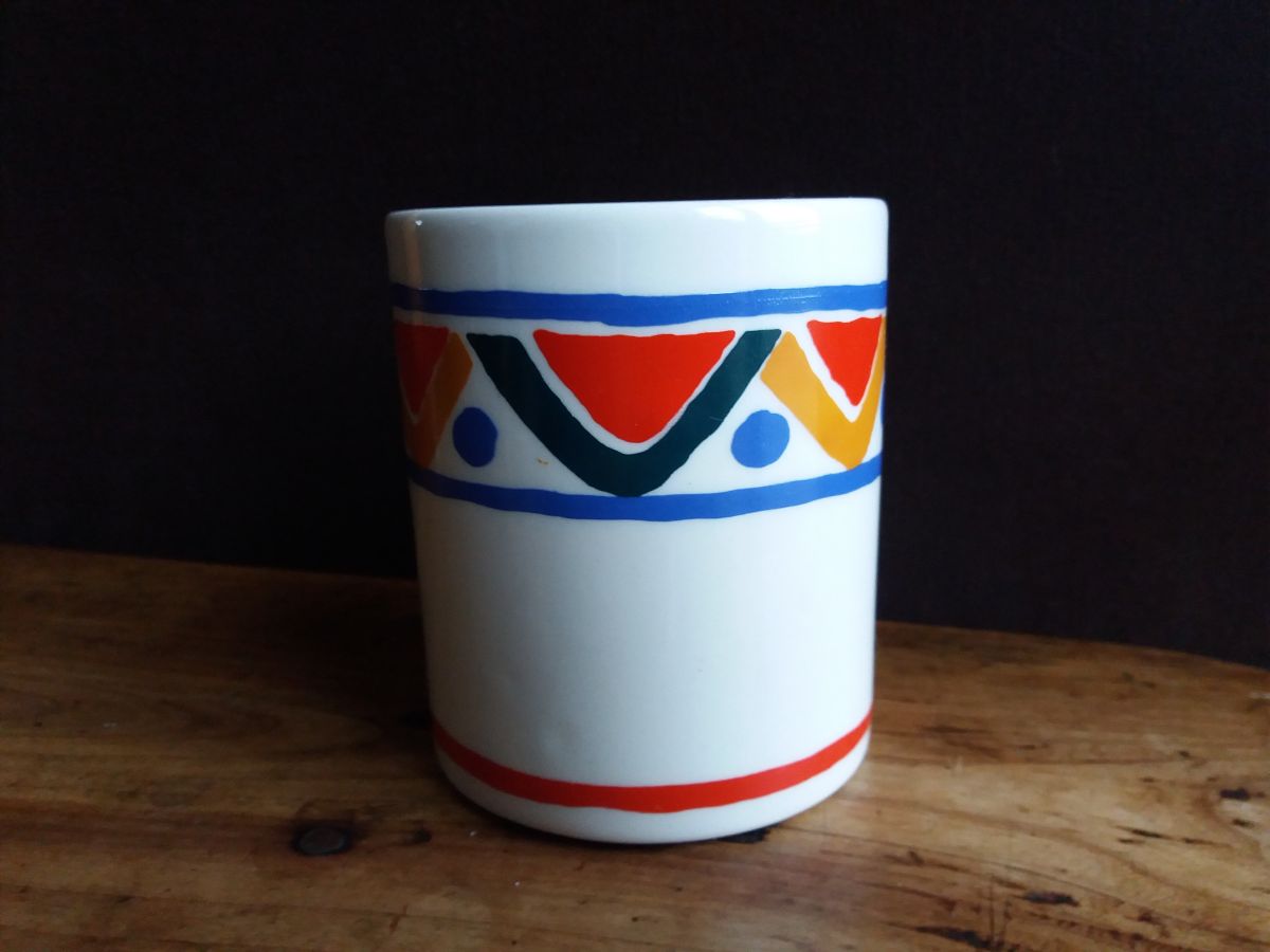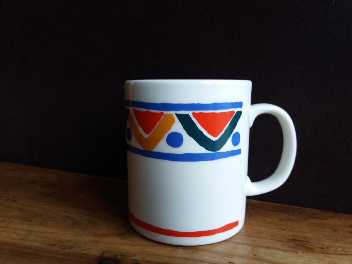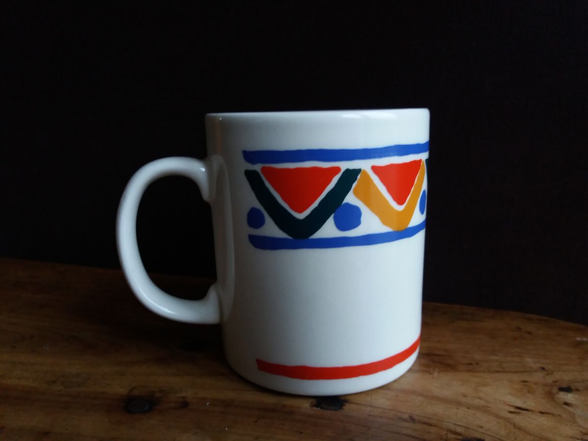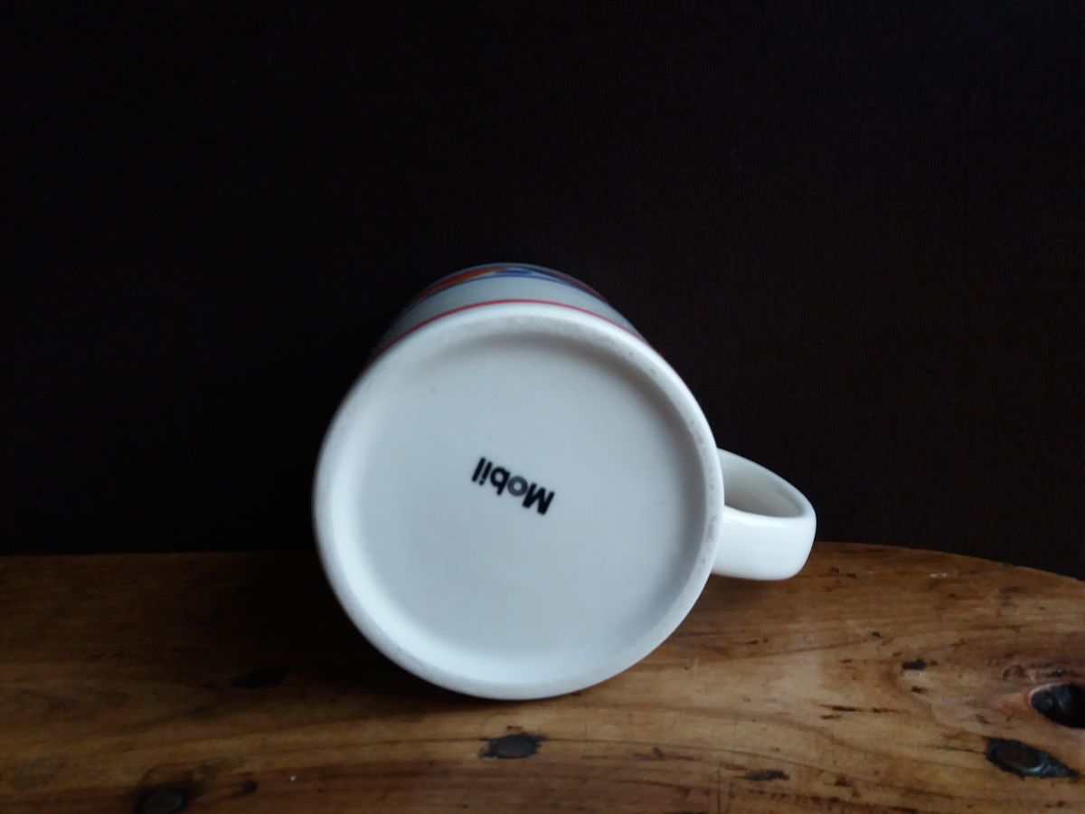 Mug estampillé Mobil dessous, objet publicitaire que les clients des stations essences pouvaient commander en collectionnant des points dans les années 80. Il me semble qu'il y avait trois modèles différents, rayure bleu, rayure rouge ou rayure mauve en bas. Ce mug est en parfait état, il n'a pas du être lavé souvent et encore moins au lave-vaisselle! le décor est intact, bien coloré, l'estampille de la marque est intacte aussi. D'infimes et rares rayures au fond du mug, quasiment invisibles. Ce mug mesure 9 cm de hauteur, 11.5 cm de largeur anse comprise, 8 cm de diamètre