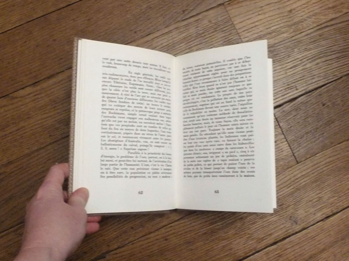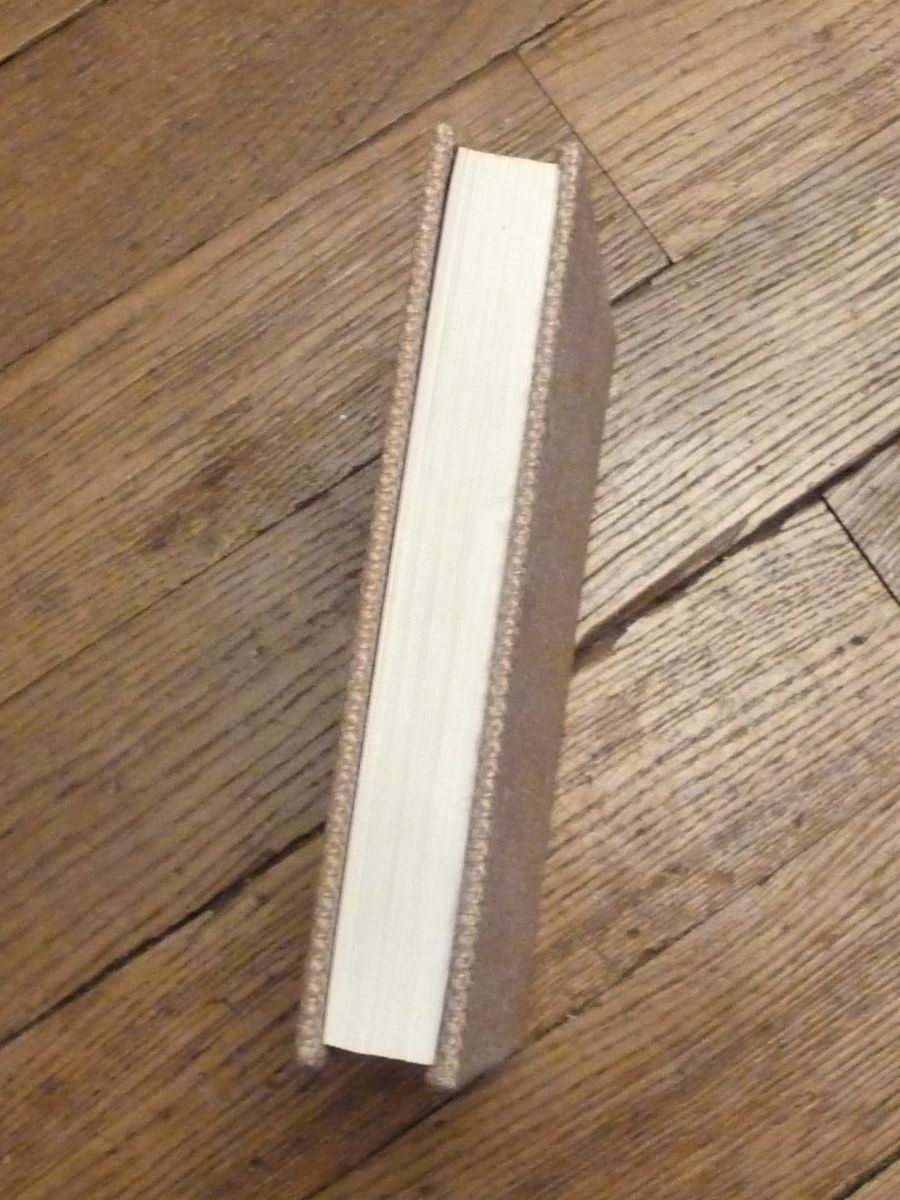 en très bon état, avec sa fiche descriptive, sa couverture rigide en toile de jute beige un peu décolorée et une inscription sur une page