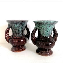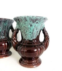Vase à anse West Germany en faïence marron et beige, hauteur 27cm, diamètre 14cm, bon état.