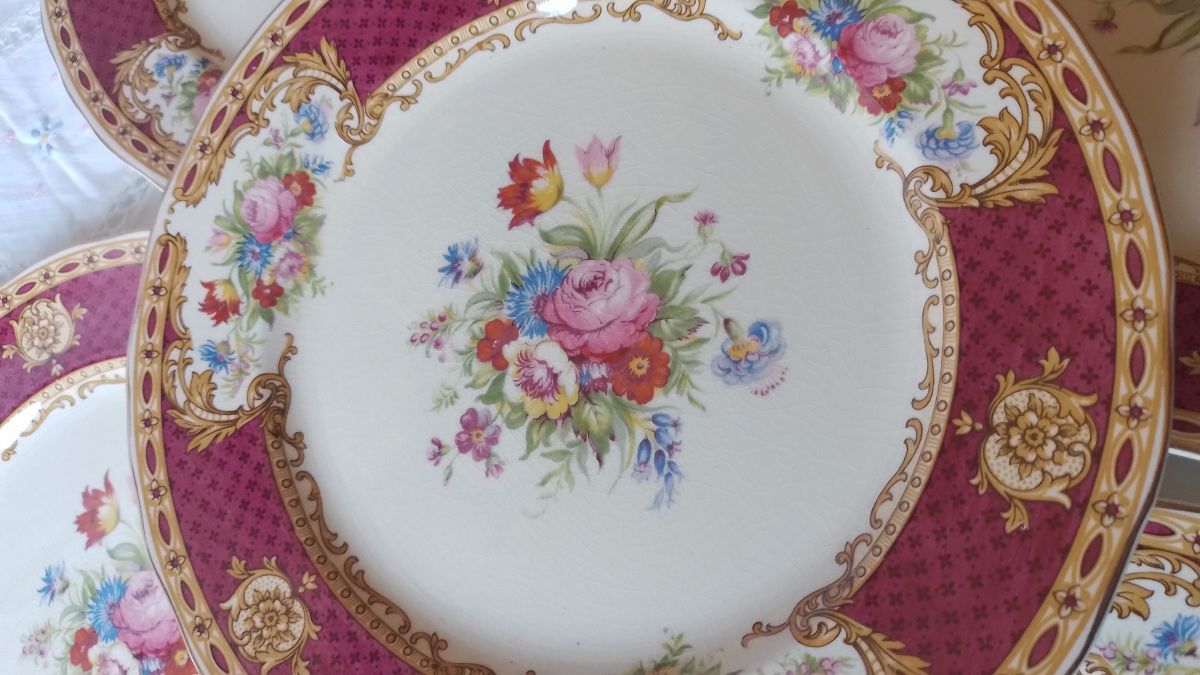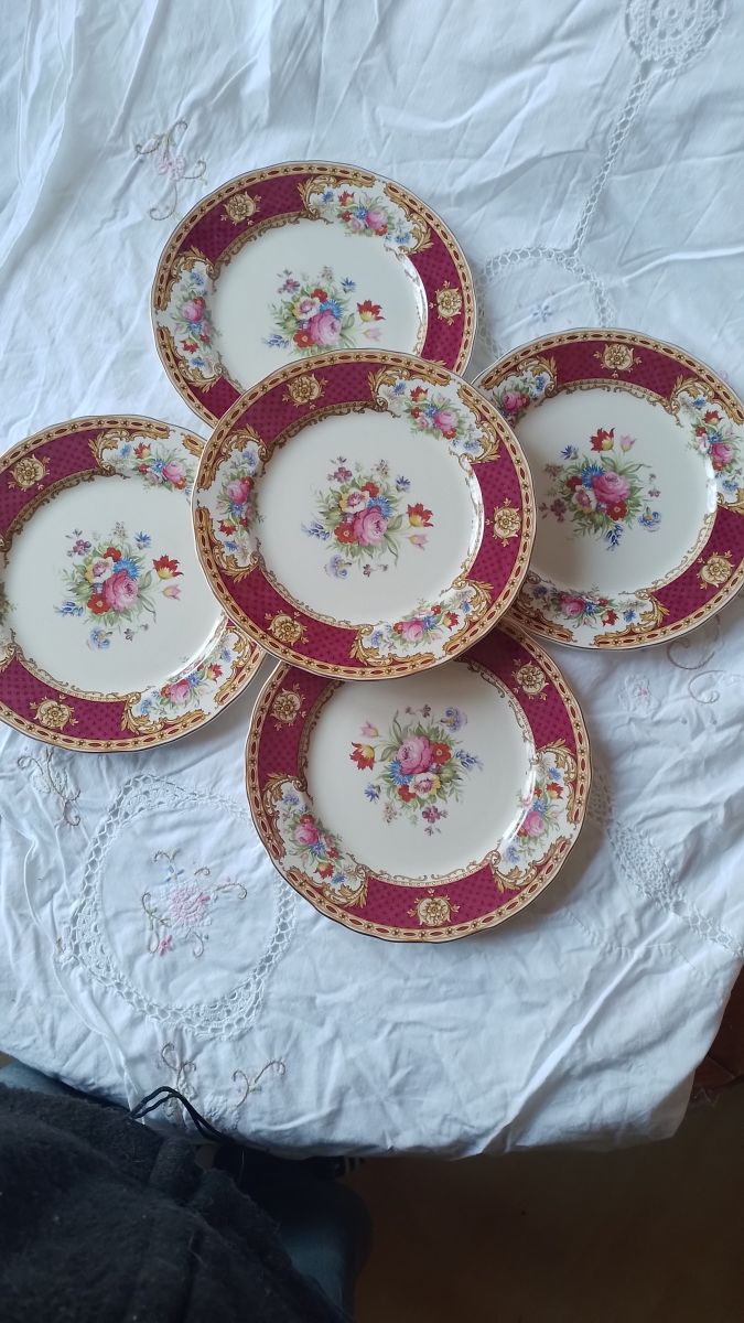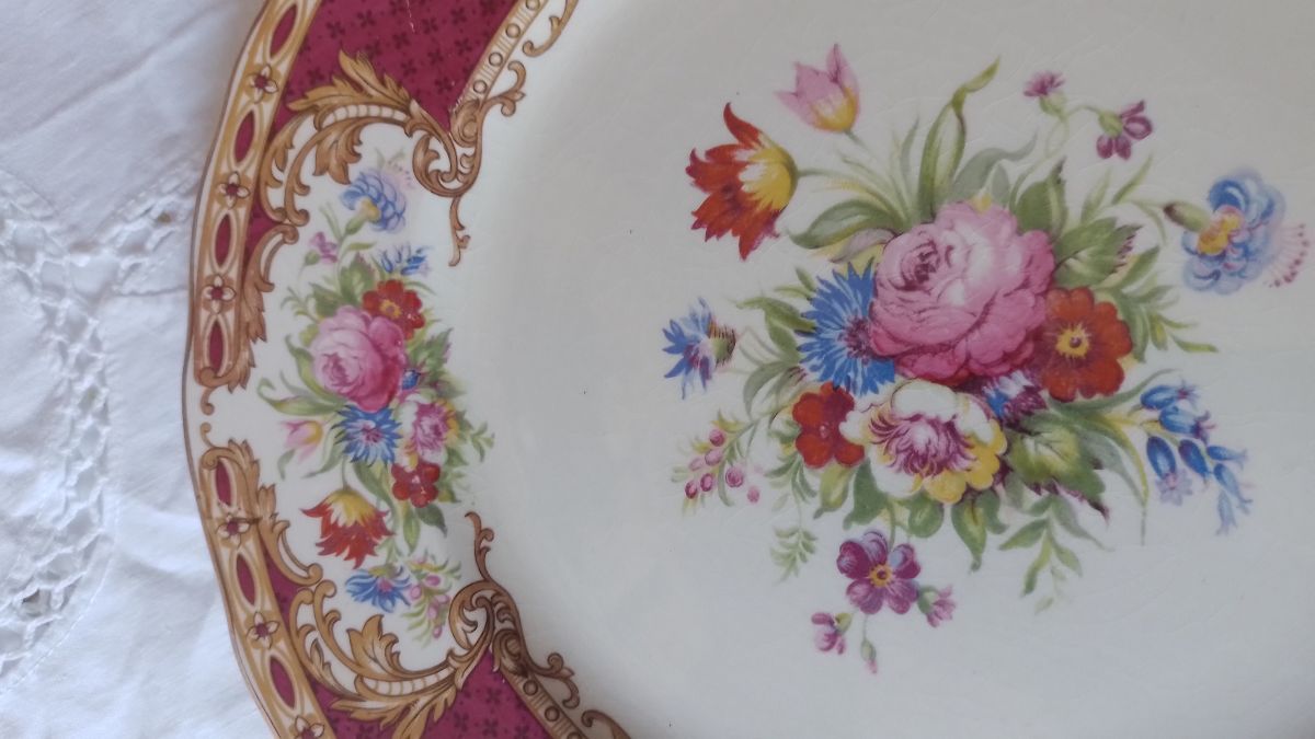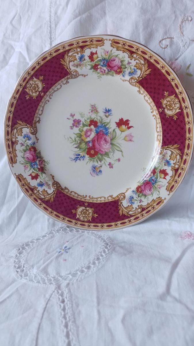 Rouge, Crème, Or, Rose; décor floral avec des rinceaux et des bords classiques dorés. 23cm de diamètre.