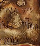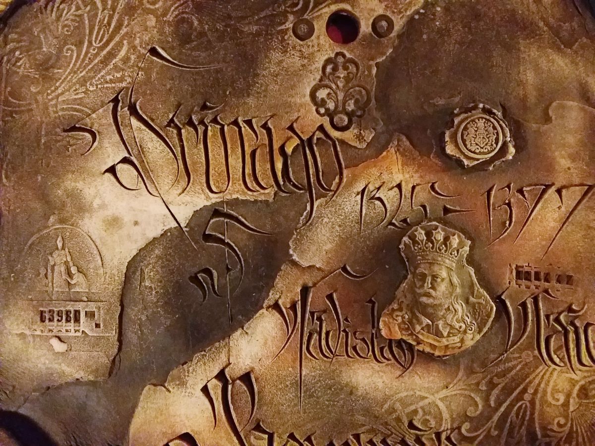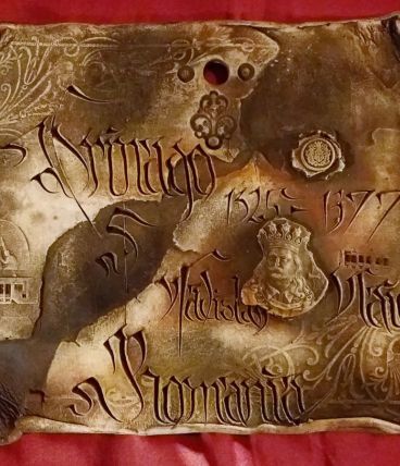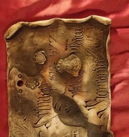Terre cuite en forme de parchemin, lettrage réalisé dans la pierre, poinçons et enluminures en relief, en l’honneur de Vladislav Vaicu, Prince de Valachie 1325 1377.Roumanie.