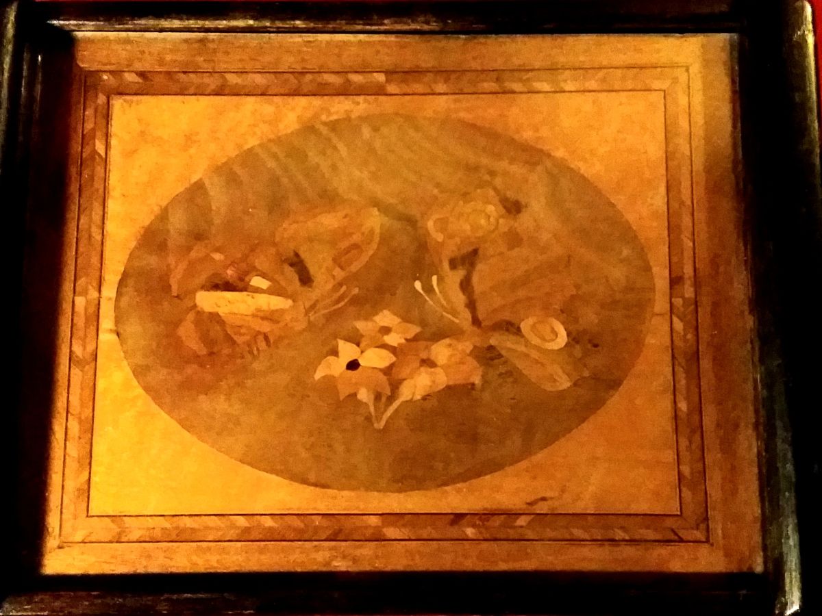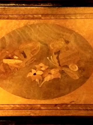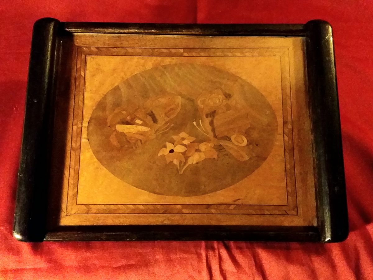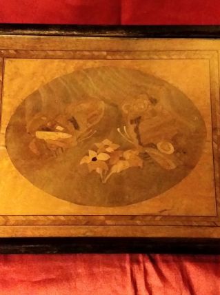 Petit Plateau en Marqueterie représentation de Papillons et Fleurs, datant des Années 1920,de très belle façon.