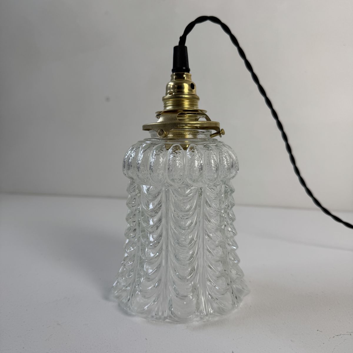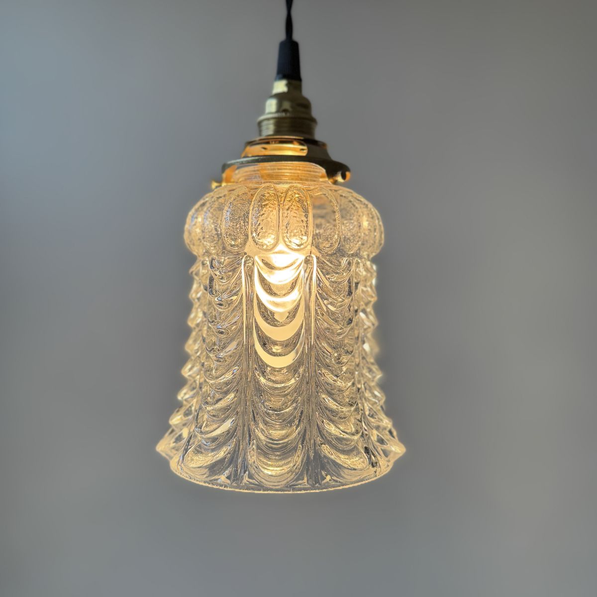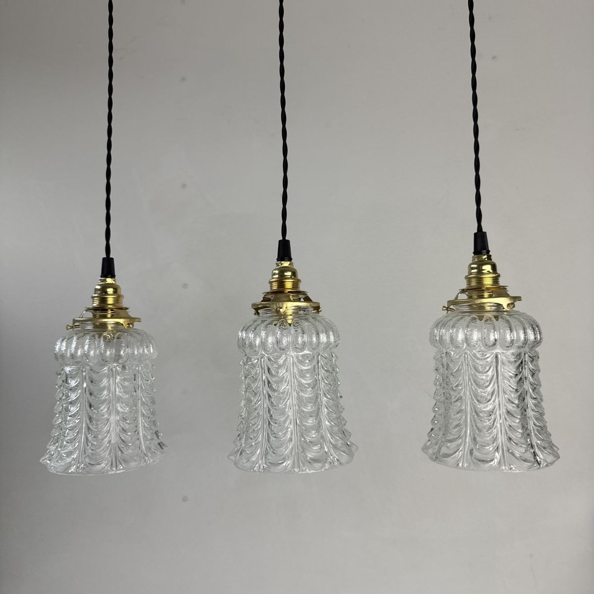 Trio de suspensions vintage en verre moulé. Lumière tout en douceur. En bel état.