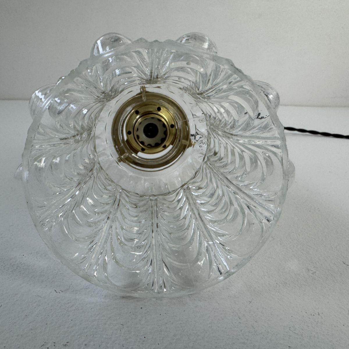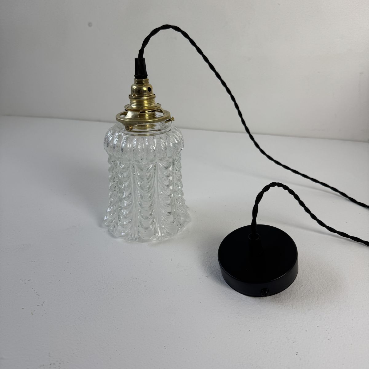 Electricité refaite à neuf avec fil noir en tissu tressé. Prête à brancher par domino. Douille à vis petit culot. céramique (ampoule E14). Rosace en métal pour accroche au plafond.