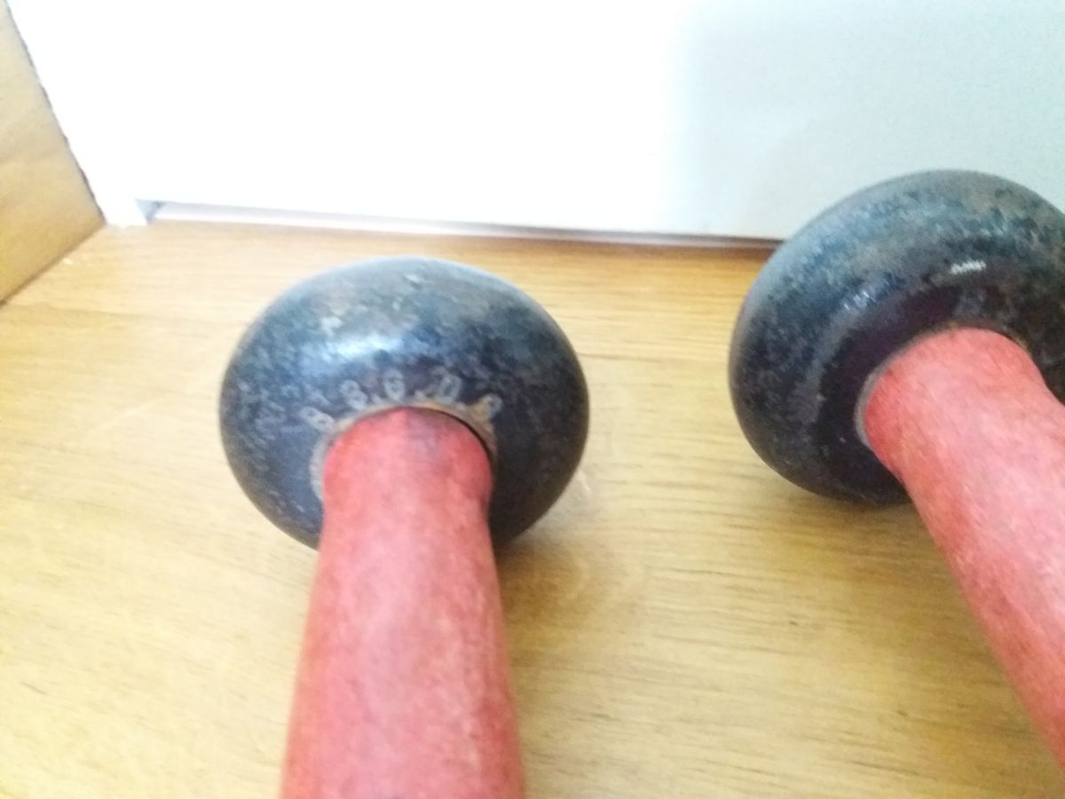 Elles sont en bon état général, bois solide, poids bien arrimés mais elles présentent évidemment la patine de leur soixantaine d’années (ou plus) : fonte dont la laque noire d’origine est largement estompée avec quelques traces de corrosion superficielle, bois un peu rugueux avec la laque rouge qui était probablement plus épaisse et brillante à l’origine et qui est à présent estompée et comporte des taches et marques.