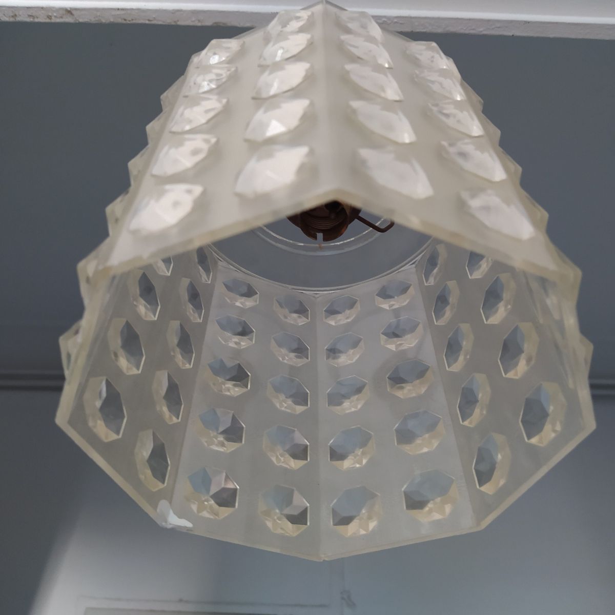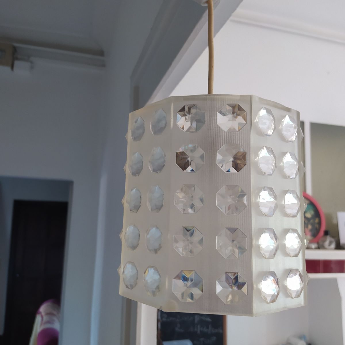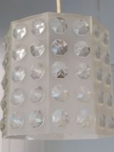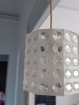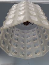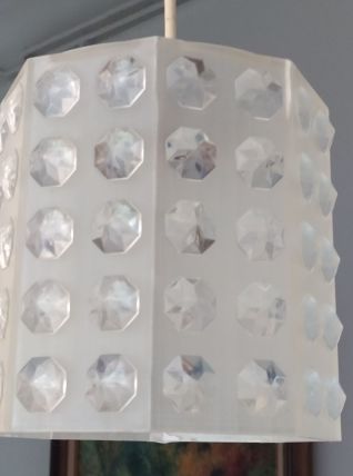 Superbe suspension Rotaflex en polycarbonate, typique des années soixante. Les huit faces sont ornées de 80 facettes taillées en diamant qui diffusent la lumière de manière optimale. Fixation du socle au lustre par un crochet amovible à trois griffes. Cloche de plafond en plastique blanc. Câblage blanc. Pour ampoule à baïonnette B22 (non fournie) Hauteur totale : 52 cm. Dimensions lustre seul : hauteur : 17cm. Diamètre : 17 cm. Poids : 550g. Excellent état