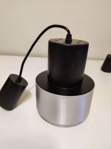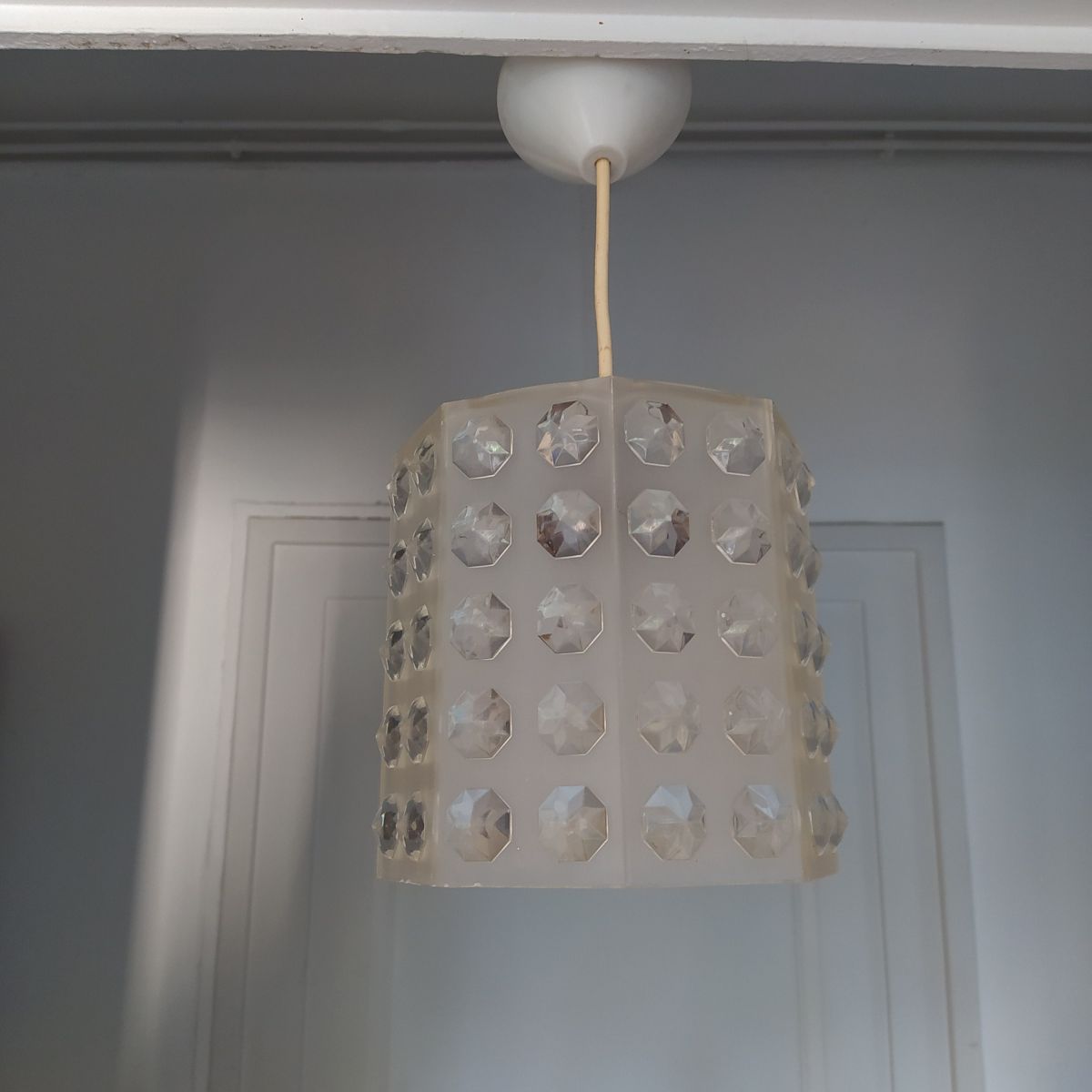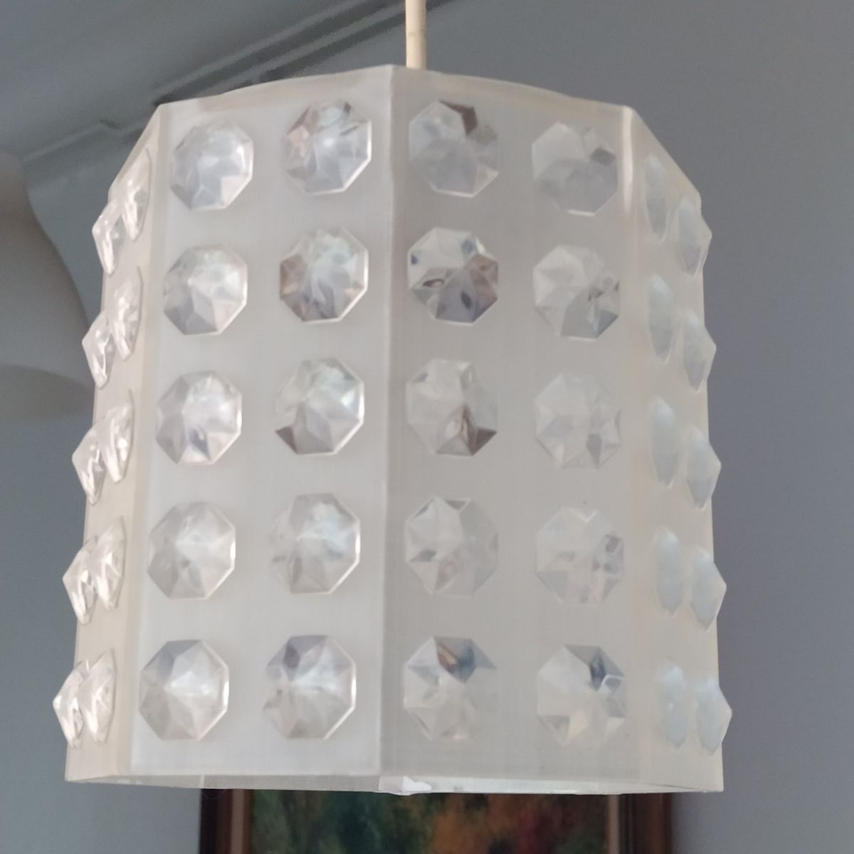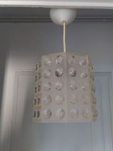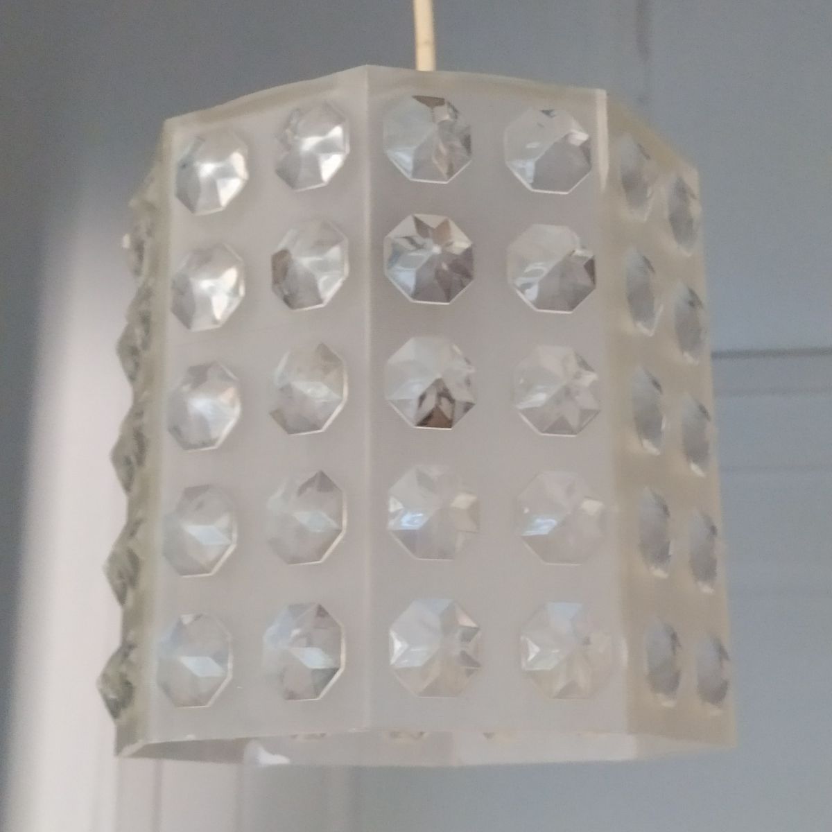 Superbe suspension Rotaflex en polycarbonate, typique des années soixante. Les huit faces sont ornées de 80 facettes taillées en diamant qui diffusent la lumière de manière optimale. Fixation du socle au lustre par un crochet amovible à trois griffes. Cloche de plafond en plastique blanc. Câblage blanc. Pour ampoule à baïonnette B22 (non fournie) Hauteur totale : 52 cm. Dimensions lustre seul : hauteur : 17cm. Diamètre : 17 cm. Poids : 550g. Excellent état