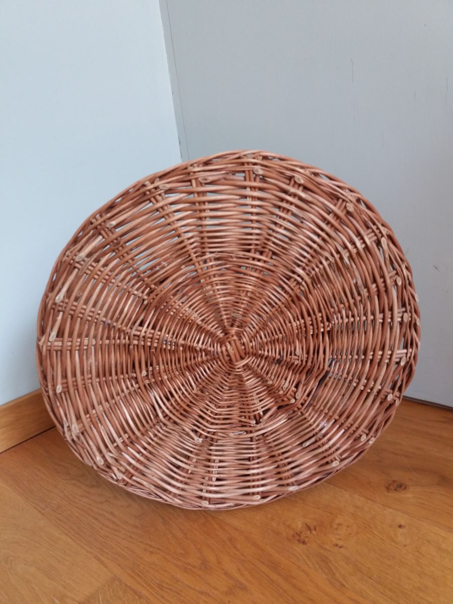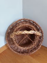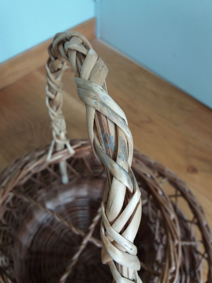Il est en bon état général, bien solide, pas de brins cassés, mais il ne cache pas quelques signes de sa soixantaine passée : l’anse et un "cordon sépare-verre" ont été remplacés par un osier clair (une époque où l’on ne jetait pas, où l’on réparait autant que possible !), quelques traces de peinture sur l’anse et sous la base et évidemment la jolie patine de l’osier après plusieurs décennies.