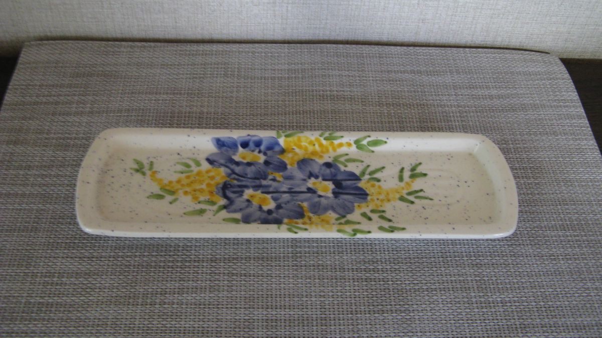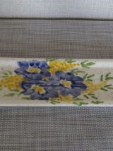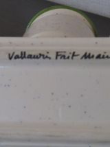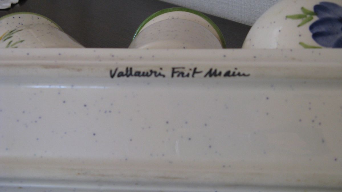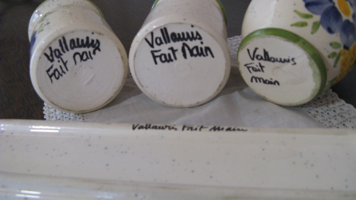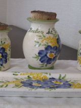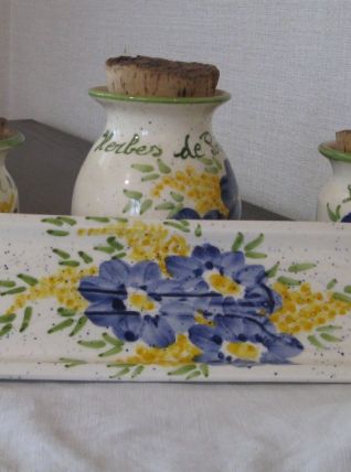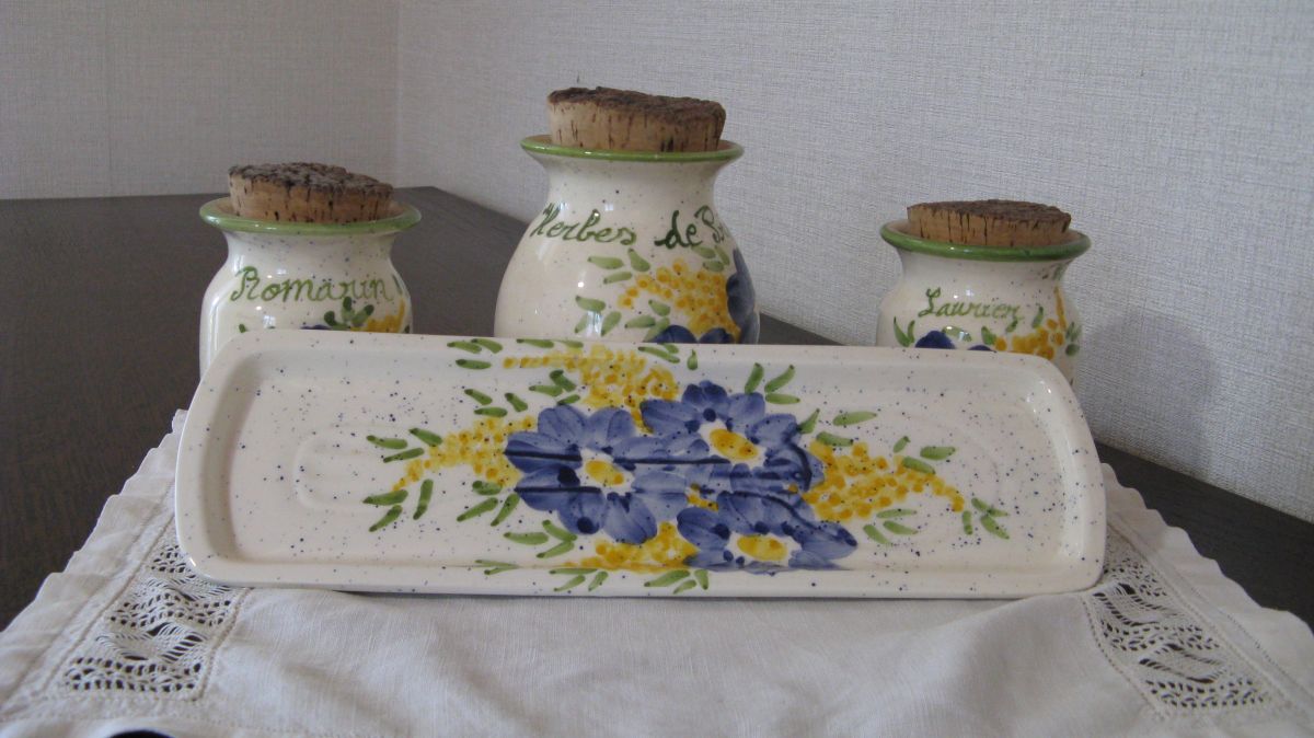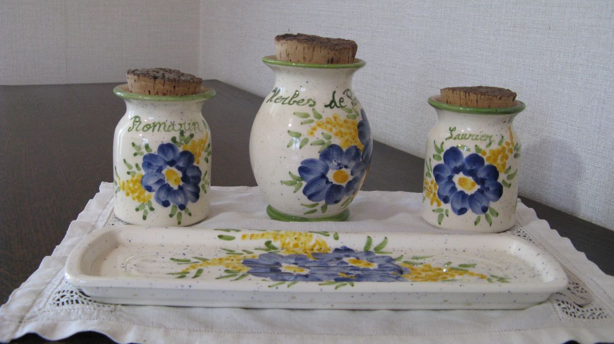 Très joli ensemble de cuisine de style provençal. Un ensemble fait main venu tout droit de Vallauris. Ii se compose de trois pots un pour le romarin (12 cm x 9 cm), un pour le laurier et un pour les herbes de Provence (9 cm x 7 cm). Il est complété par son repose cuillère (27 cm x9 cm).
