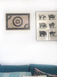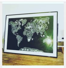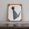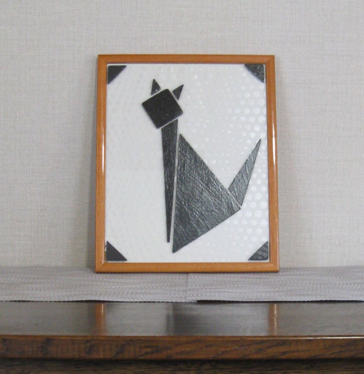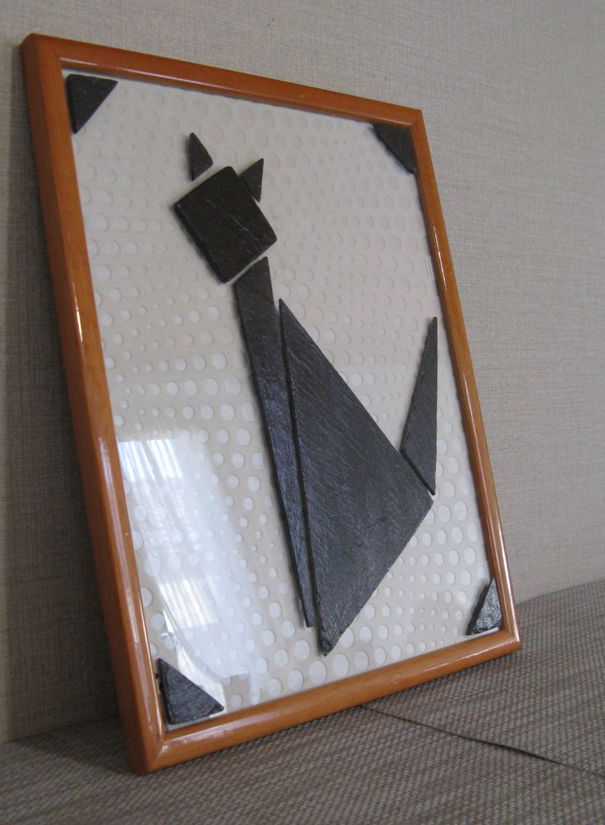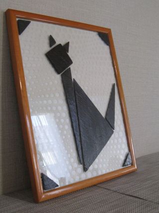 Pour donner vie à ce cadre, j'ai réalisé un chat en ardoise qui est collé sur la vitre. En arrière plan j'ai positionné un papier moderne blanc avec des ronds en relief.