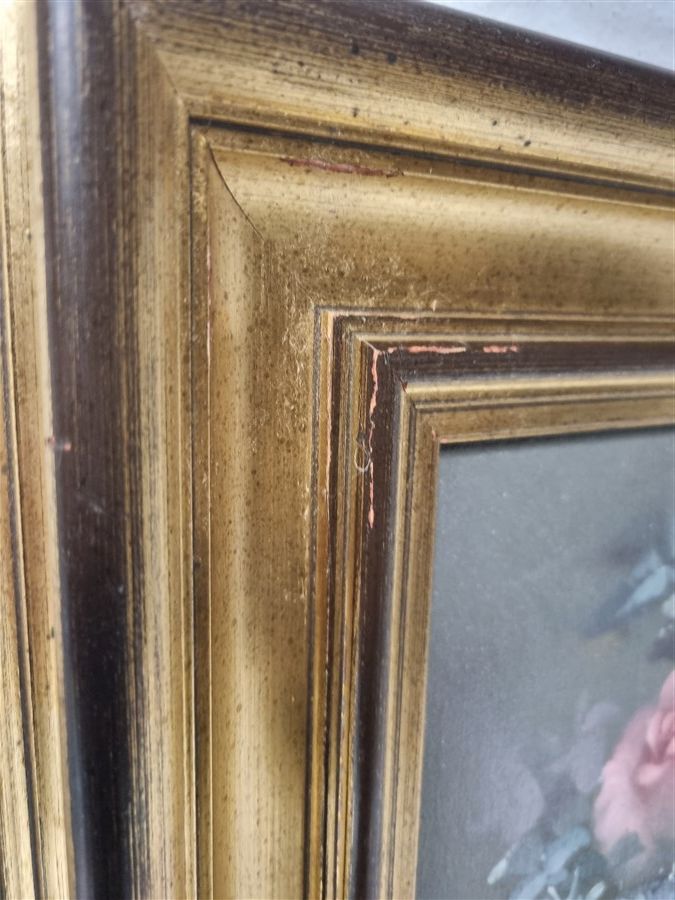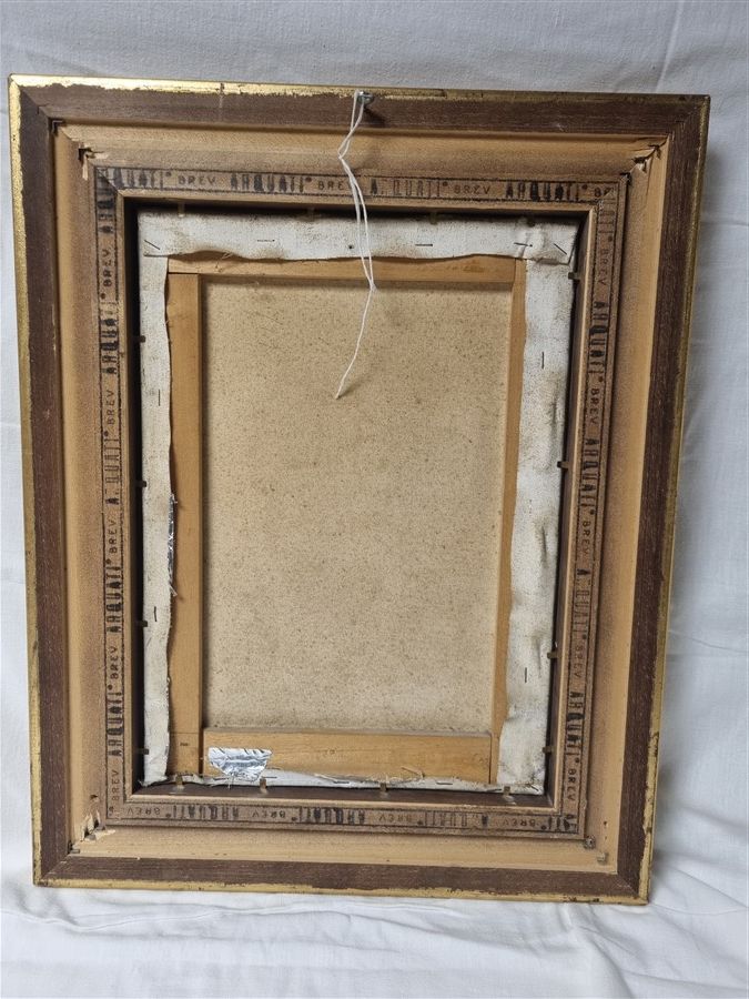 Cette peinture est dans un cadre en bois de couleur dorée, qui présente des traces d'usage ici et là, rien de très important.
