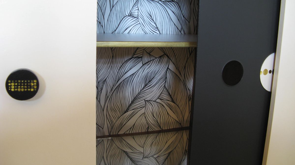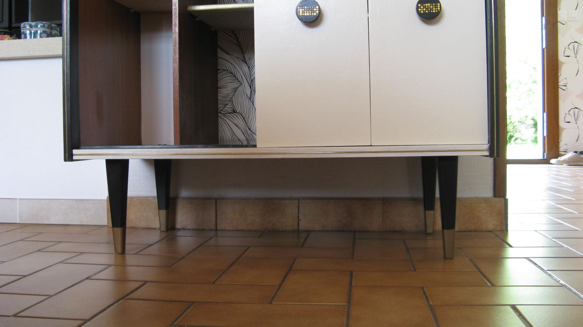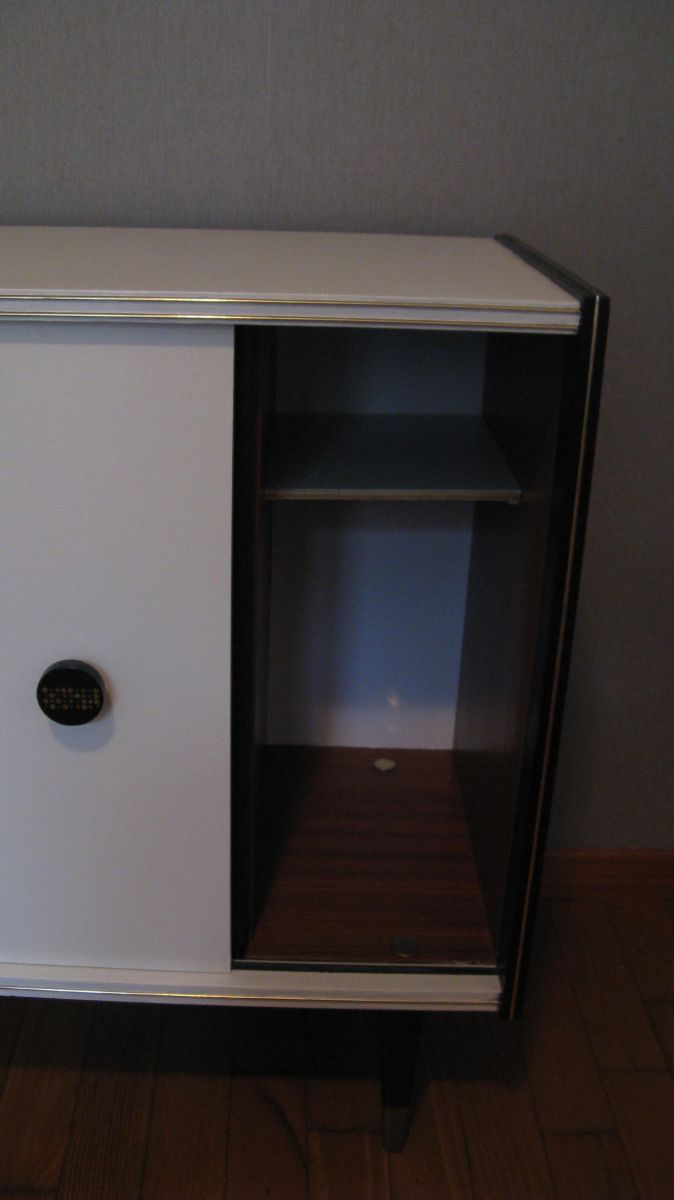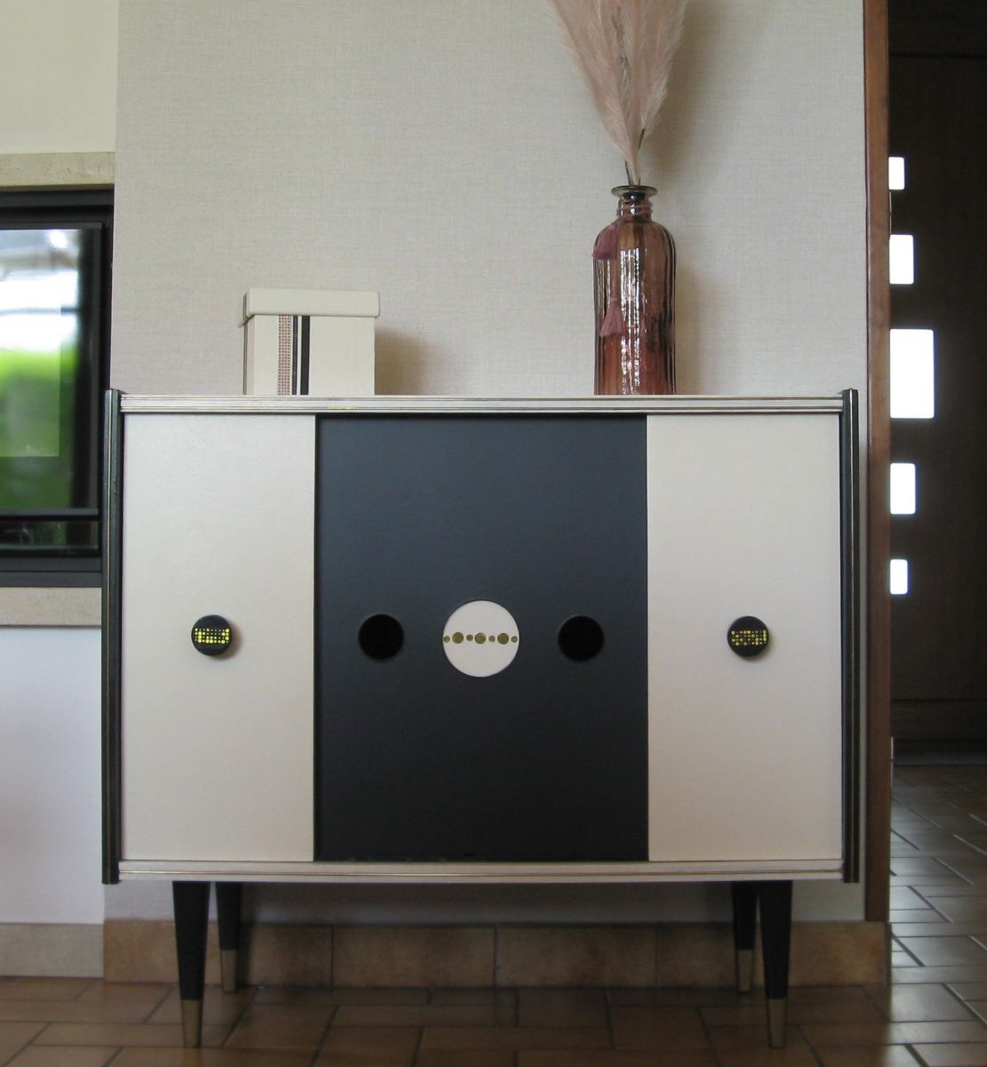 Un meuble des années 50 relooké juste pour vous. Grâce à sa faible profondeur de 39.5 cm et ses trois portes coulissantes il ne prendra que peu de place. Il s'intègrera facilement dans votre salon, salle à manger et pourquoi pas votre bureau et même la chambre. Il accueillera sans difficulté, vos verres, bouteilles et même classeurs ... suivant la fonction que vous lui donnerez.