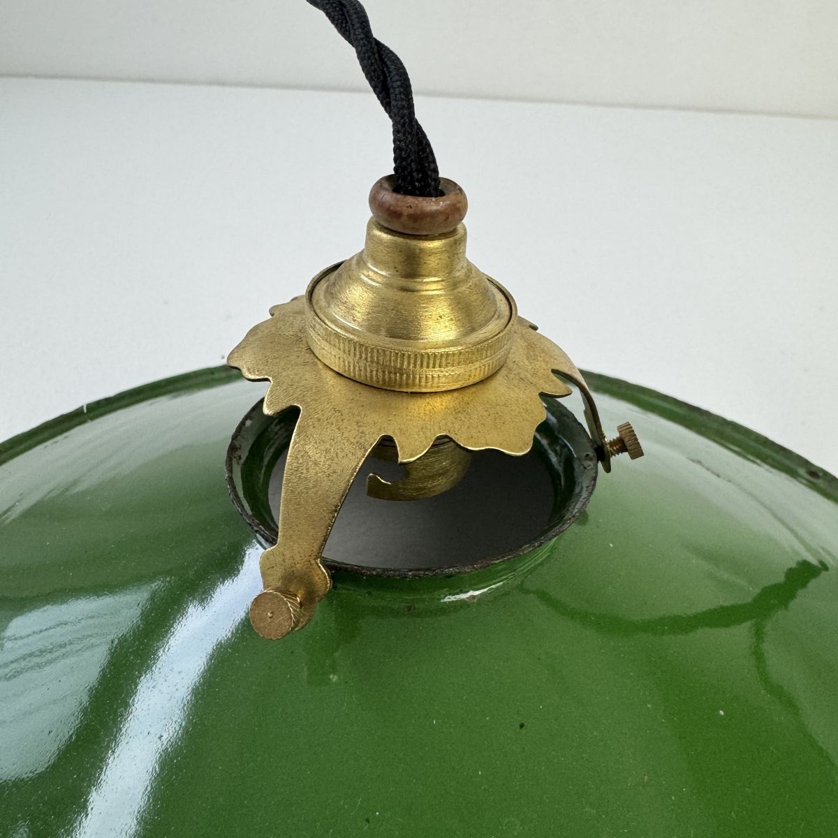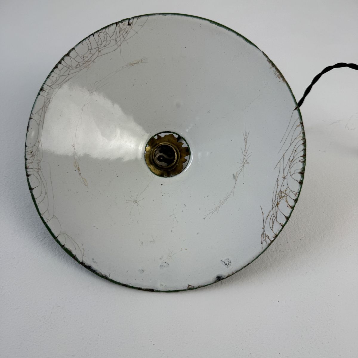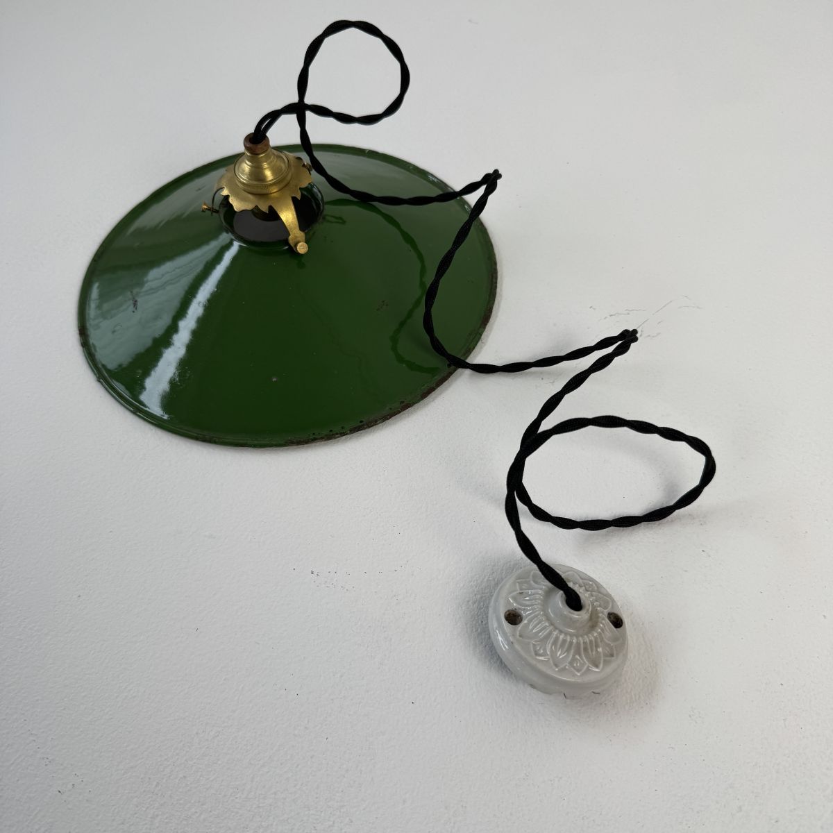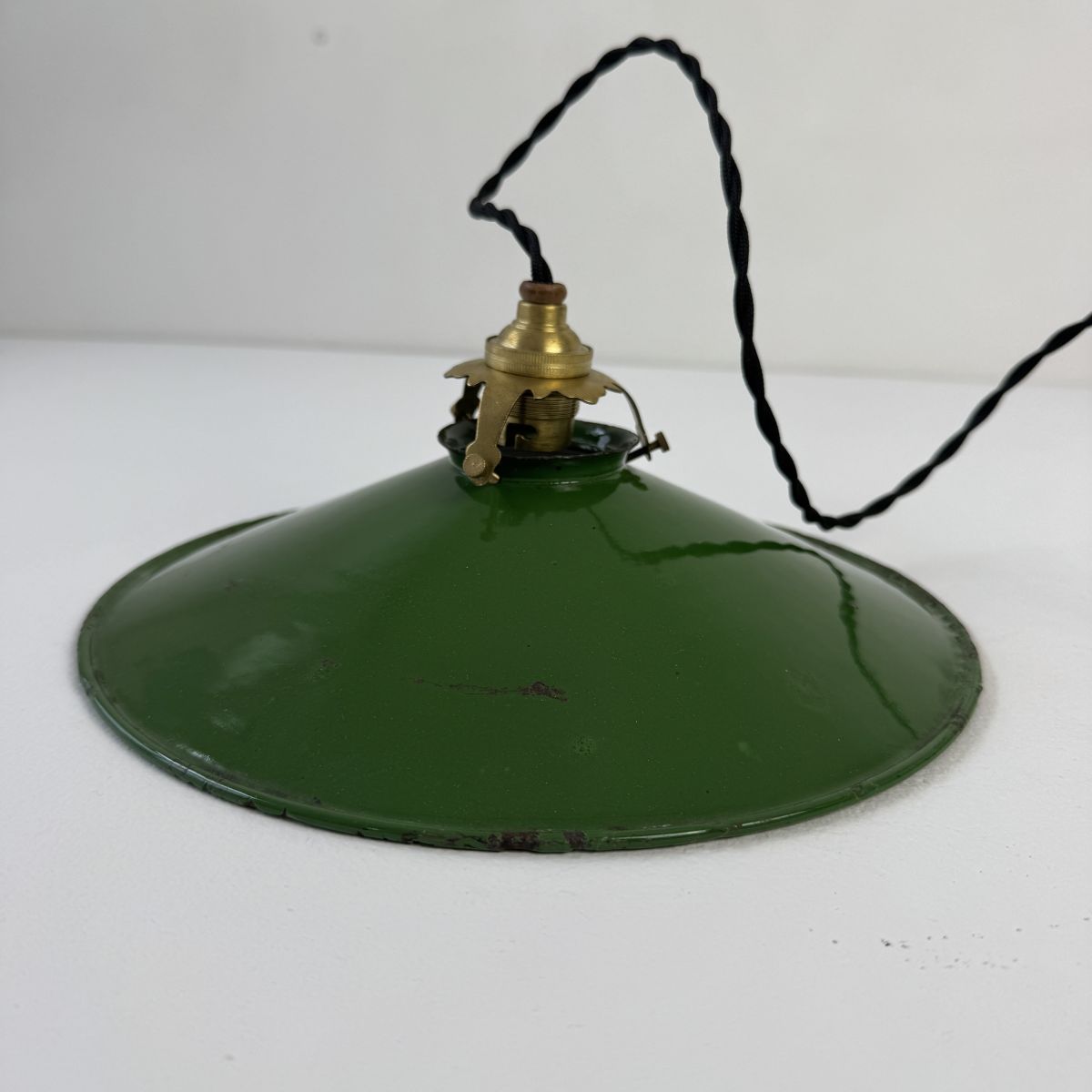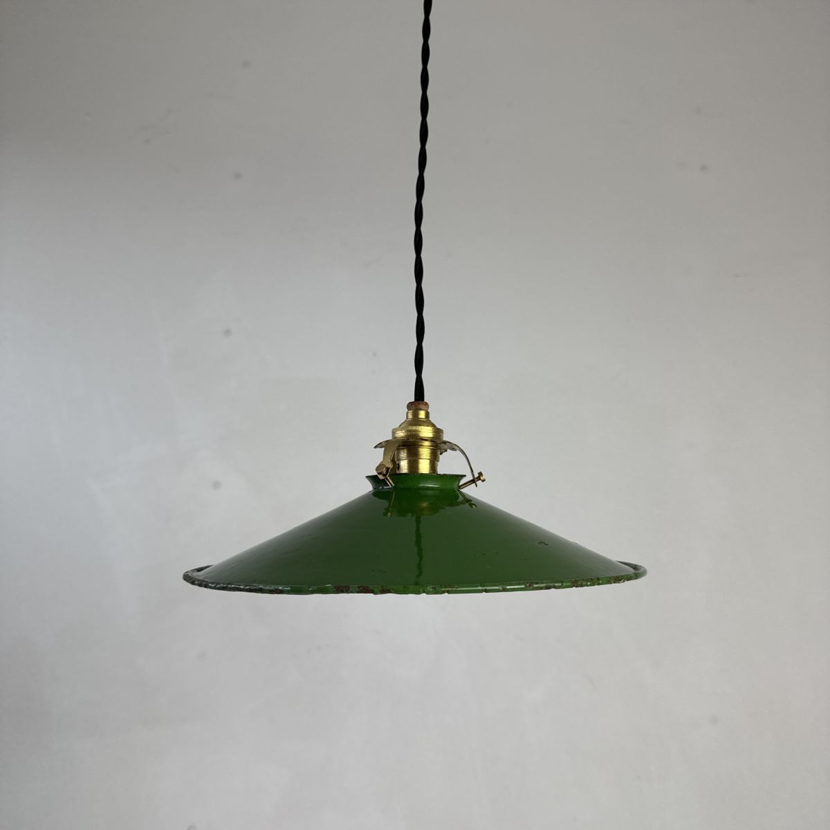 Suspension légèrement conique en tôle émaillée verte. En bel état général. Des traces de rouille et petits saut d’émail. Idéale avec une ampoule Edison.