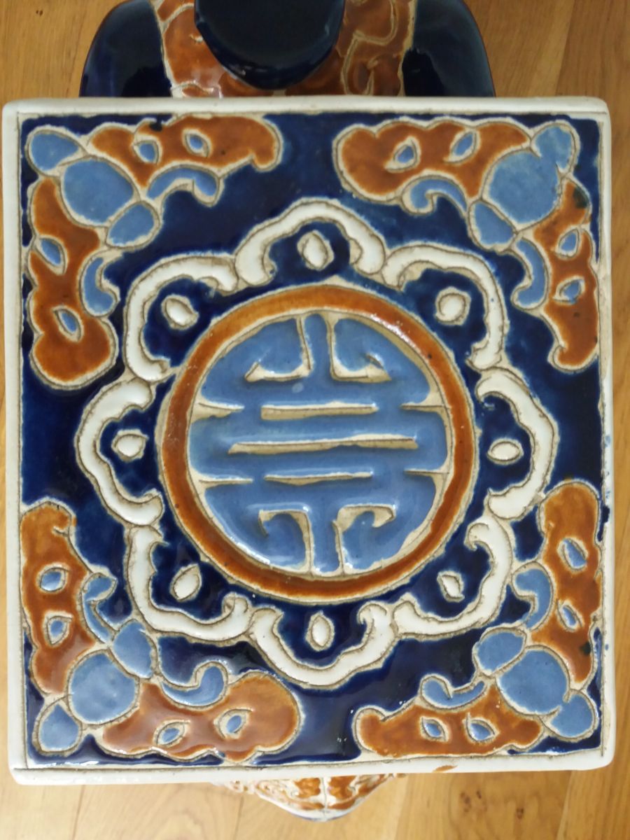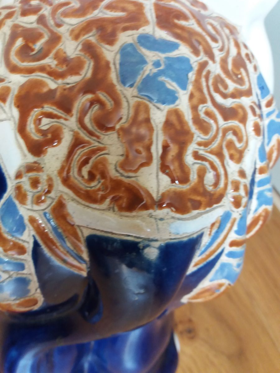 Je l’ai nettoyé avec soin, à la brossette dans tous les petits reliefs (sillons délimitant des différentes couleurs, creusés au couteau par le céramiste ), mais il reste une coloration au fond de ces reliefs qui témoignent du passage du temps.