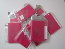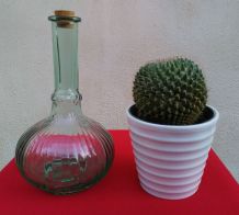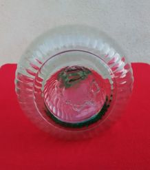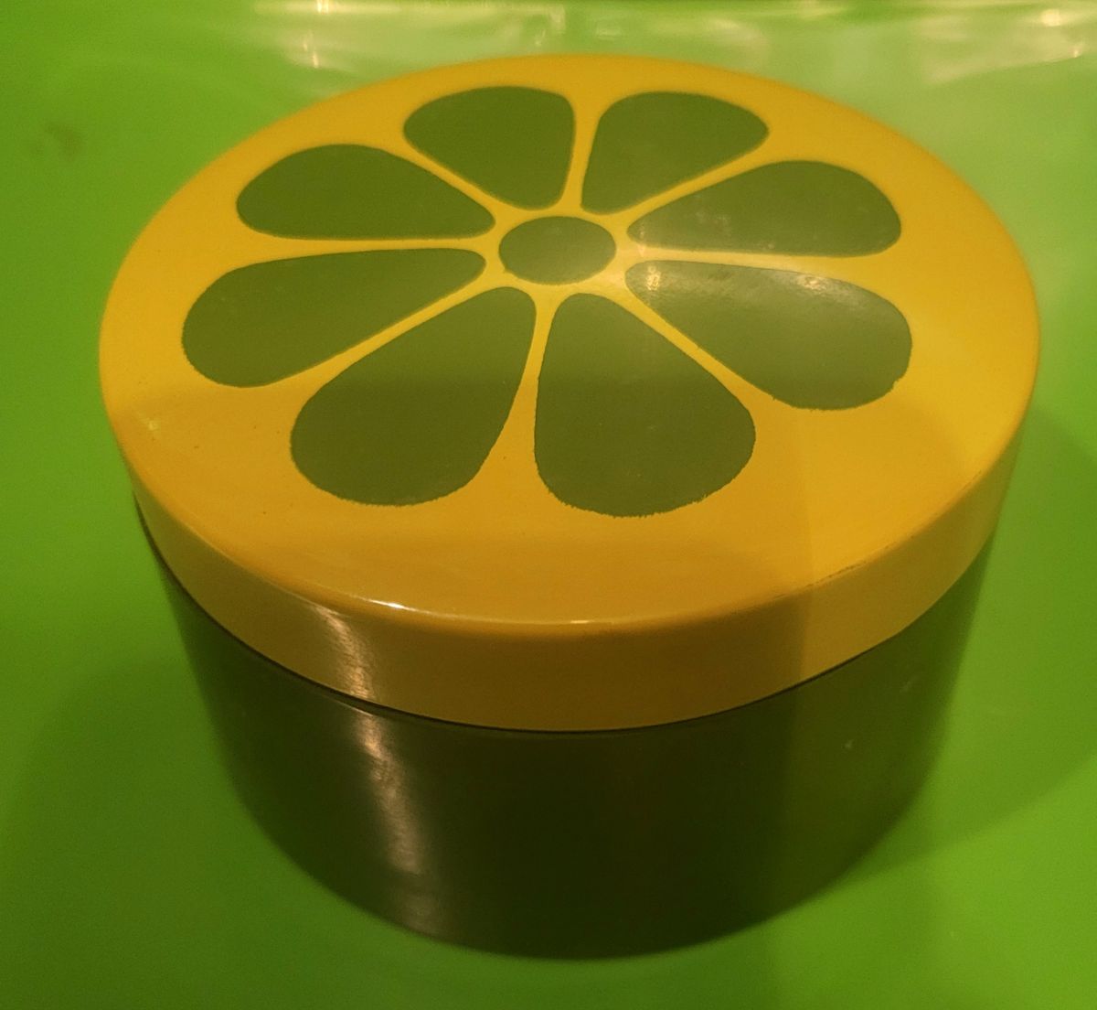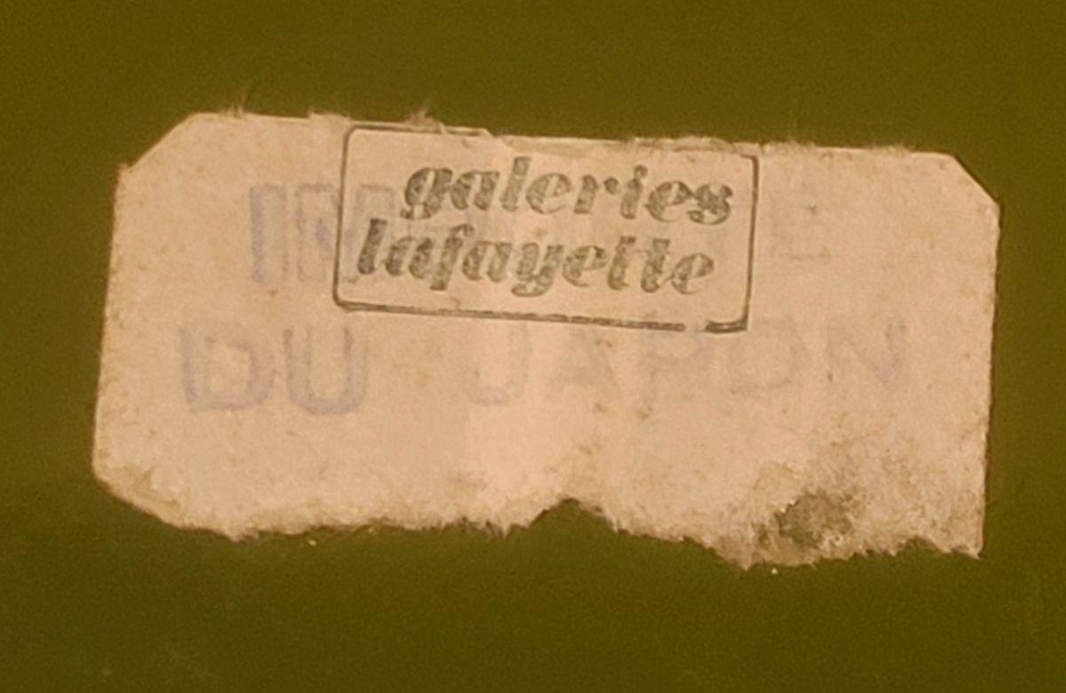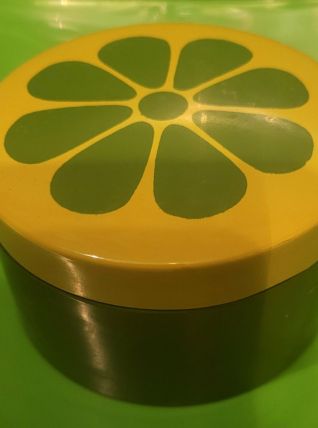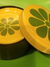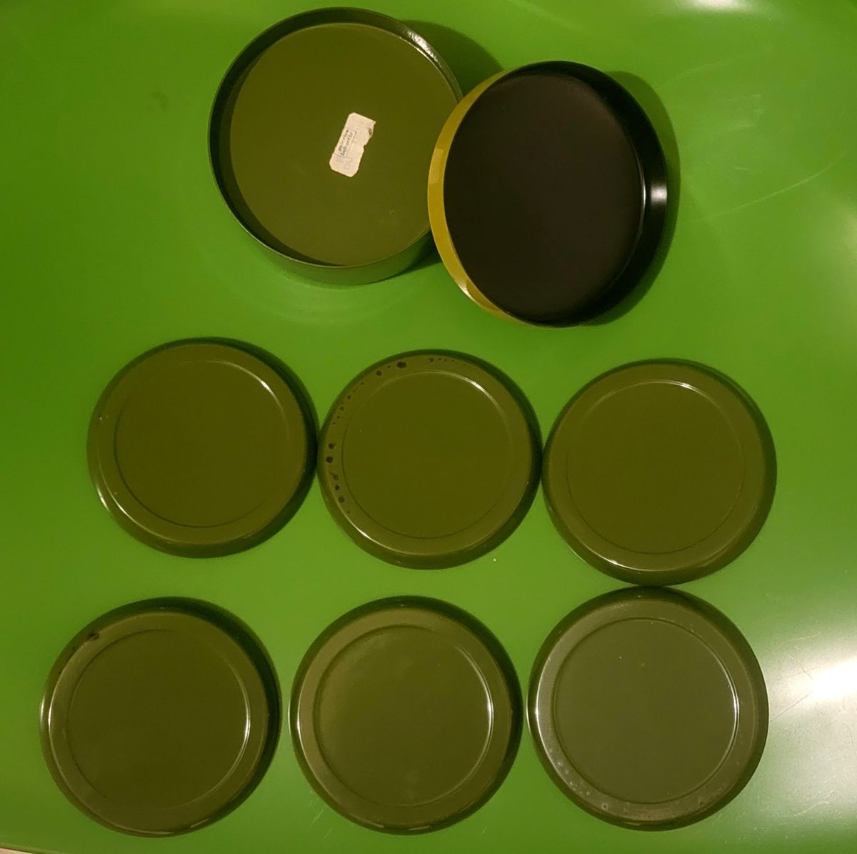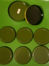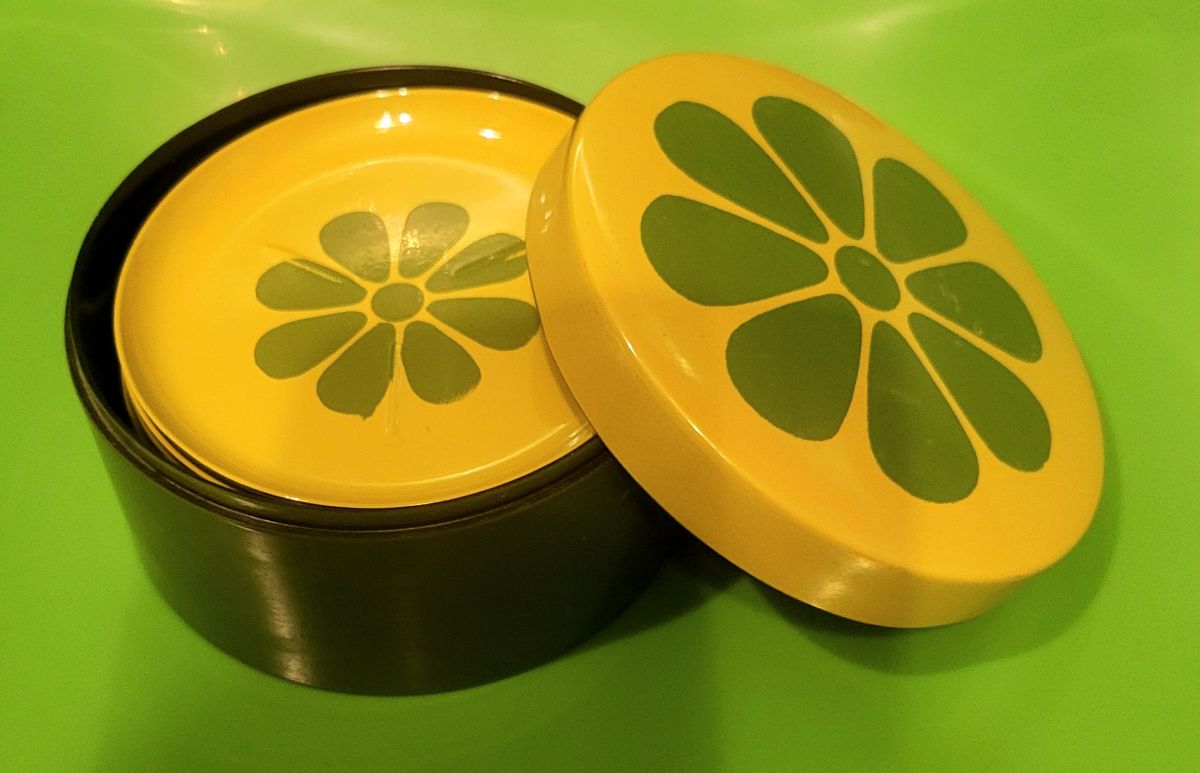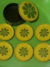 Ensemble de 6 sous-verres datant des années 70, importés du Japon pour les Galeries Lafayette, couleur vert foncé et vert clair, motifs fleurs, en plastique, rangés dans leur boîte.