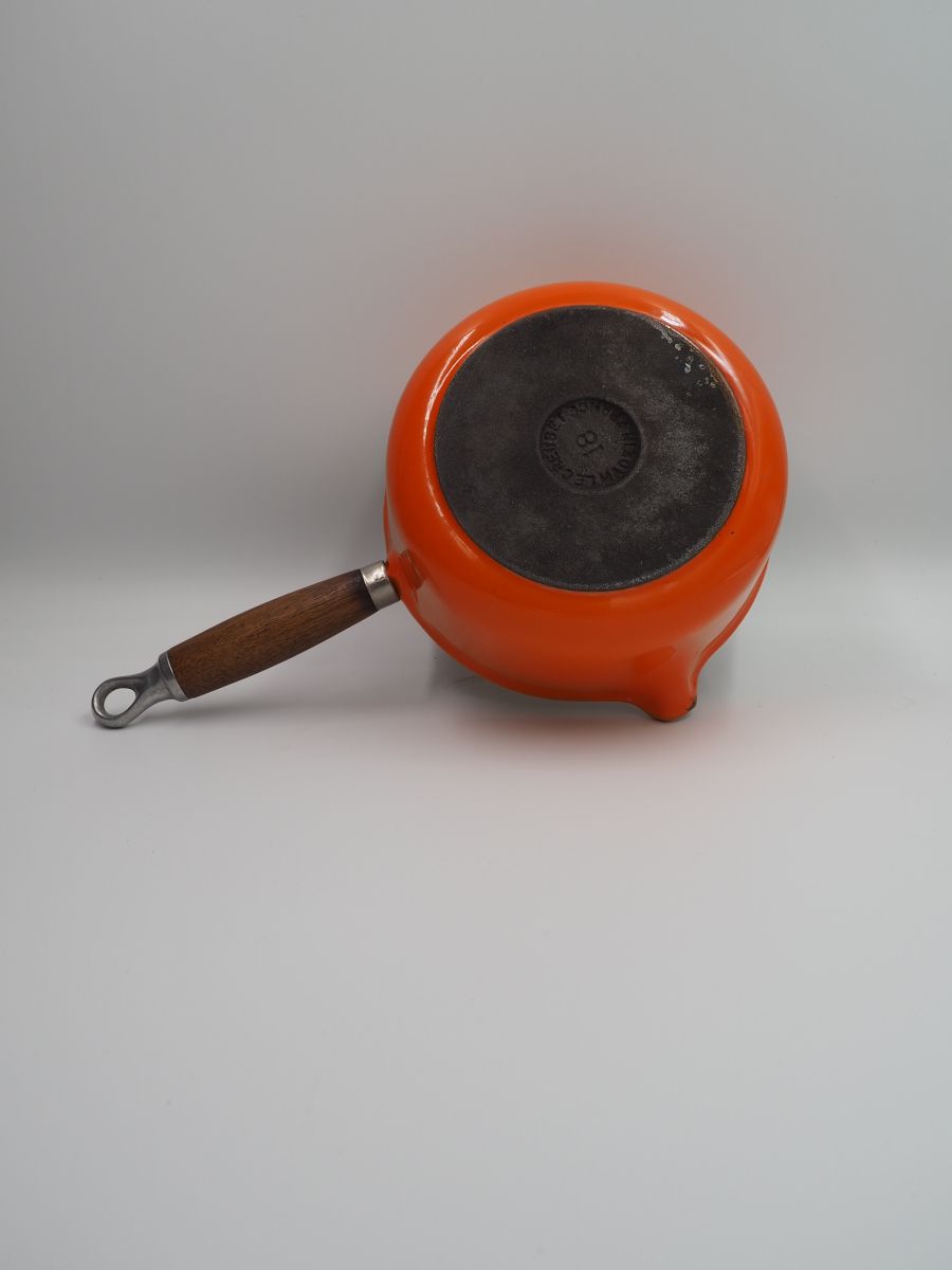 Casserole en fonte Le Creuset orange diamètre 18cm, manche en bois en bon état