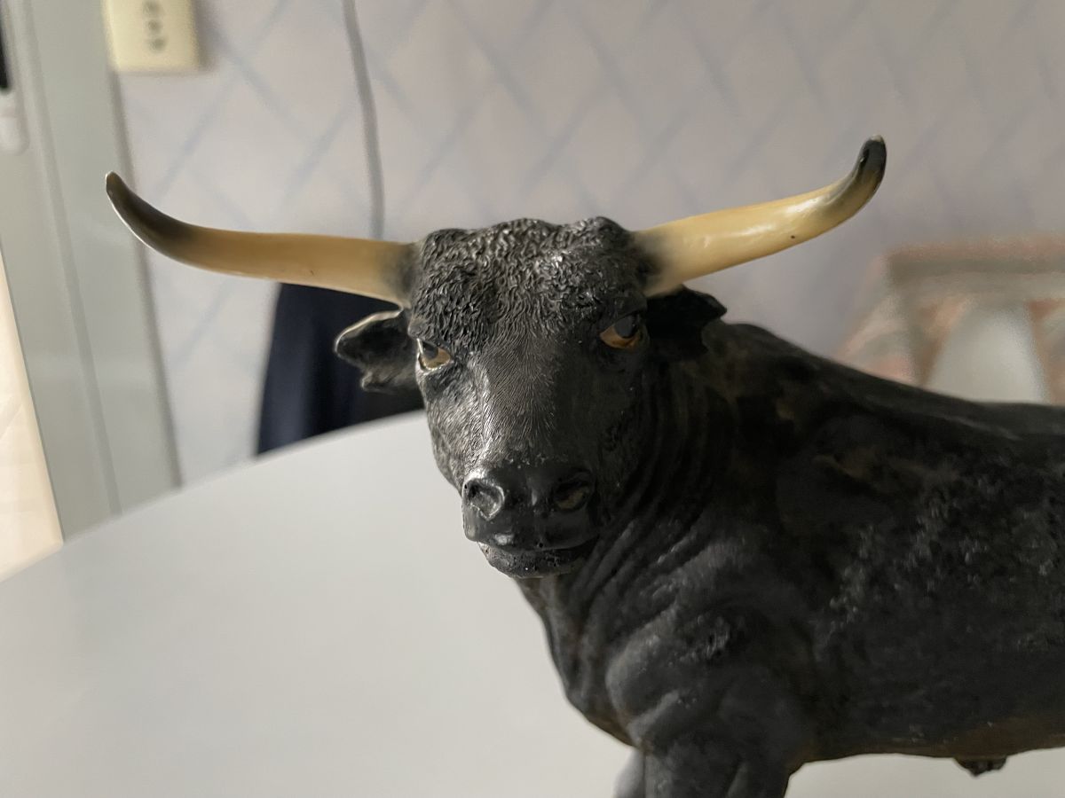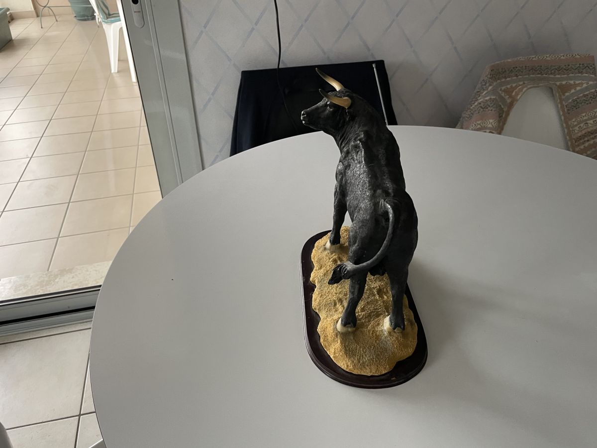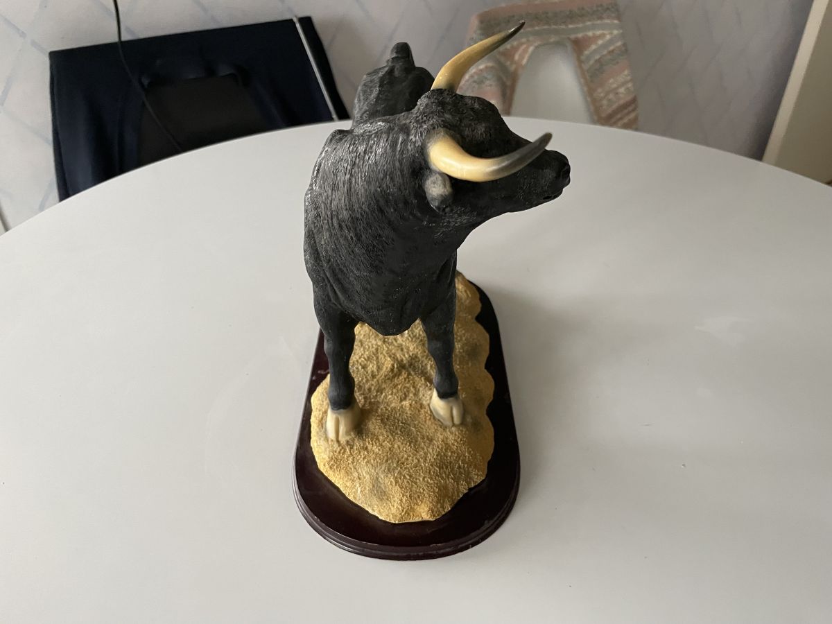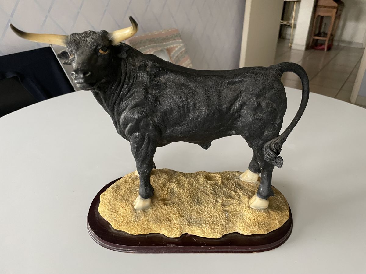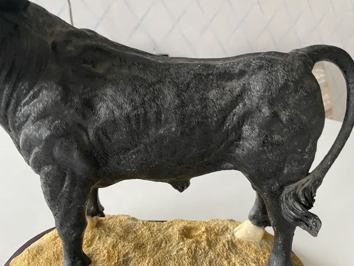 Statuette de taureau en résine colorée sur socle, très beau travail de détails, dimensions (cm) : L.29xH.26xP.15, bon état.