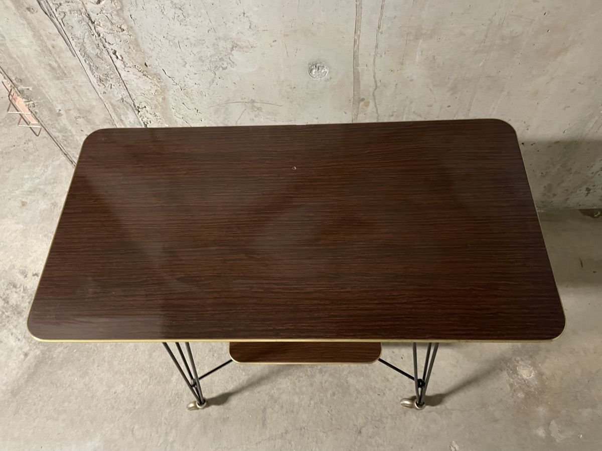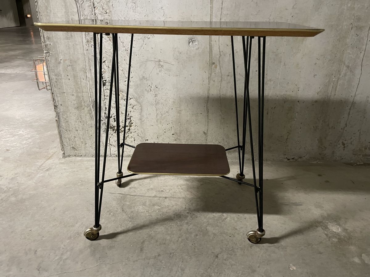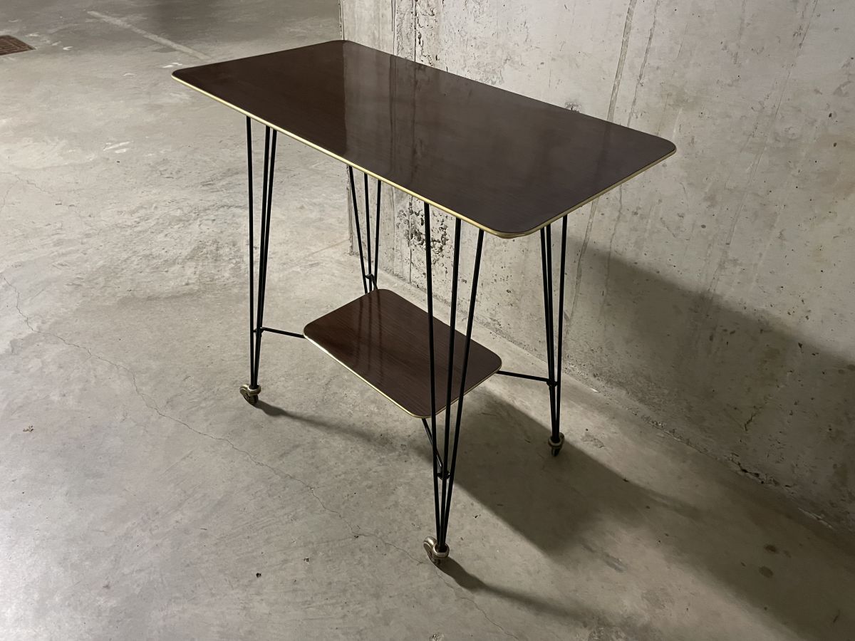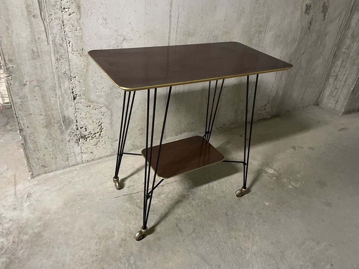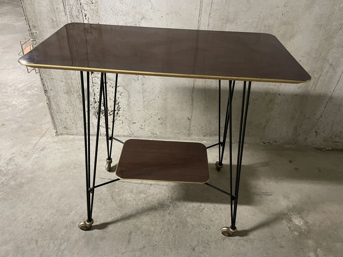 Desserte en formica marron foncé vernis des années 60, pieds Eiffel, second plateau en dessous amovible (24x36cm), un éclat, quelques rayures et traces d’usage sur le plateau principal (voir photos), dimensions (cm) : L.75xH.72xP.39, bon état général.
