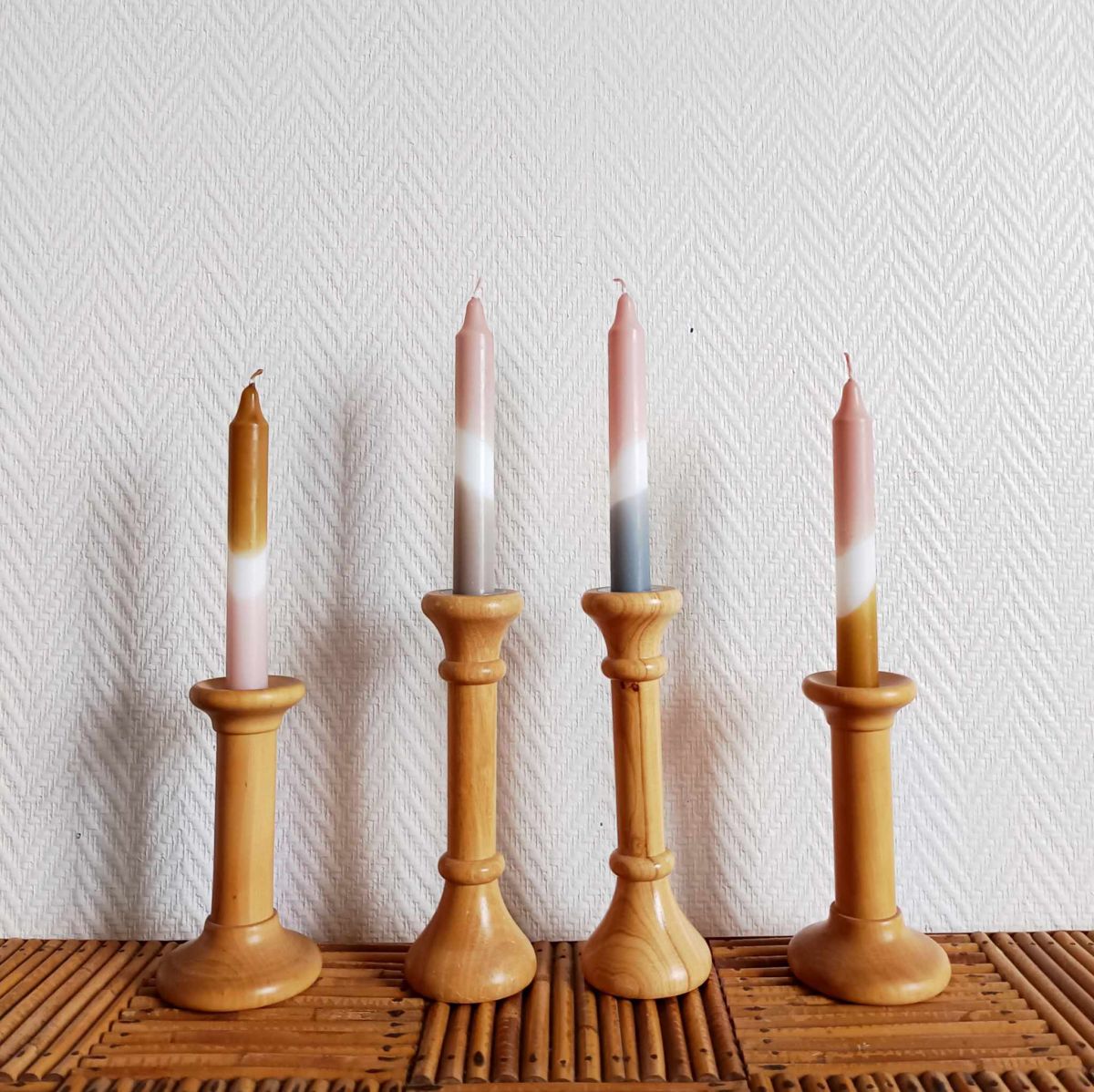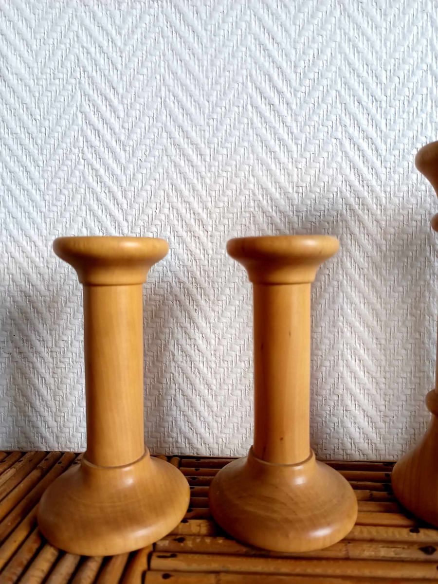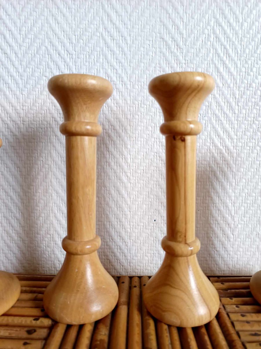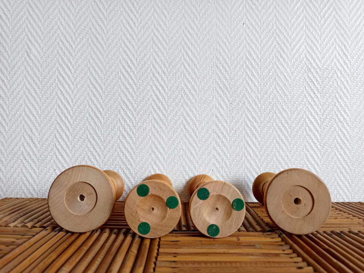 Ensemble quatre bougeoirs scandinaves en noyer, travail vintage en bobine.