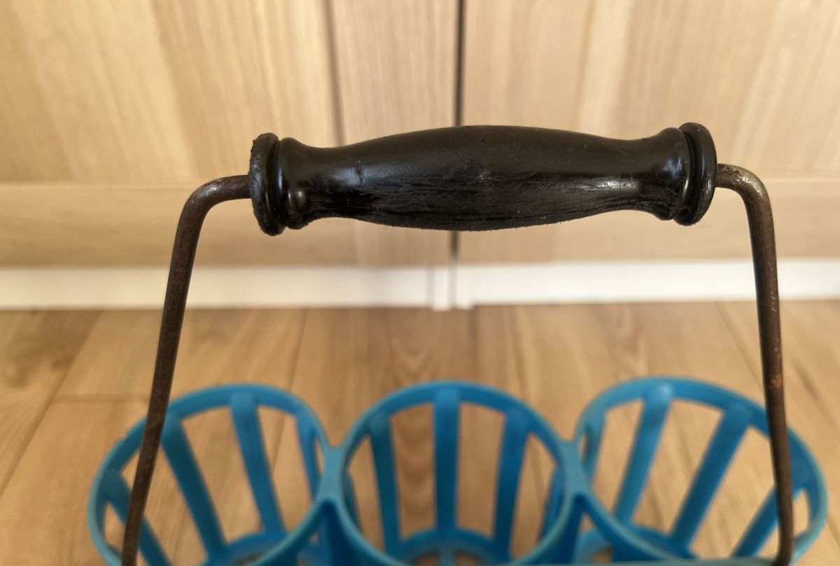 Quelques marques d’usage, dont la barre centrale légèrement décolorée, quelques rayures et oxydation de l’anse.