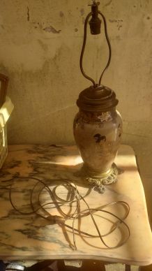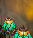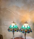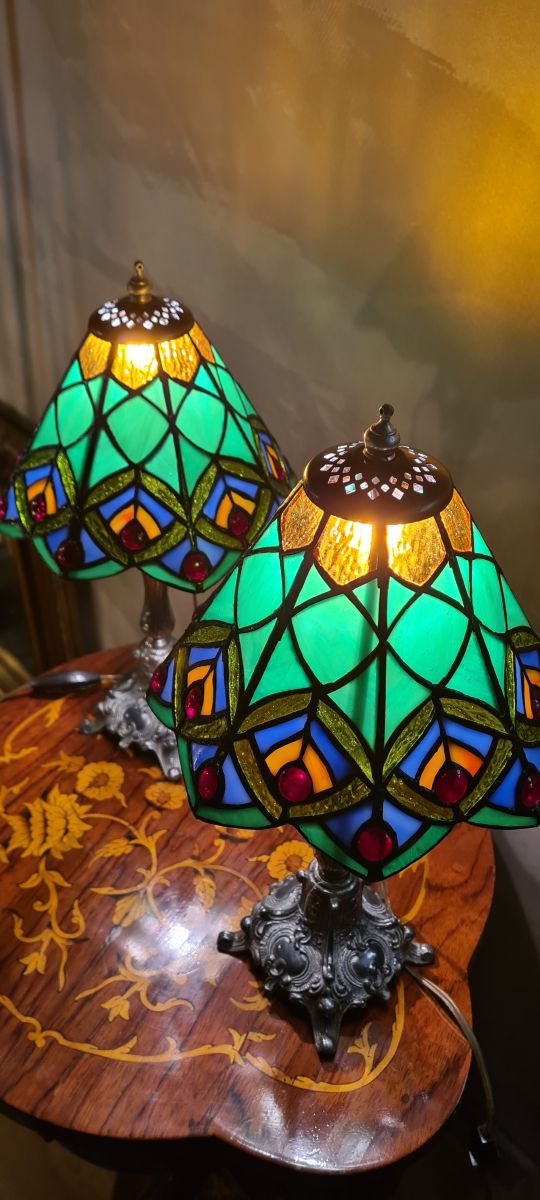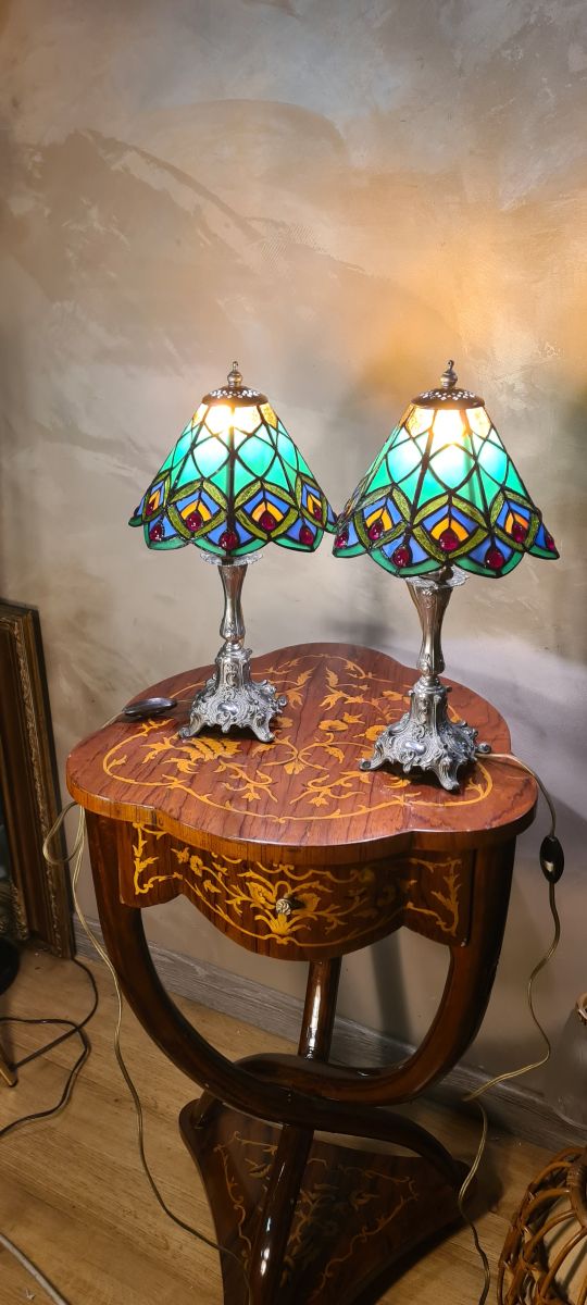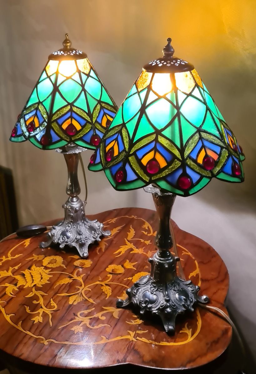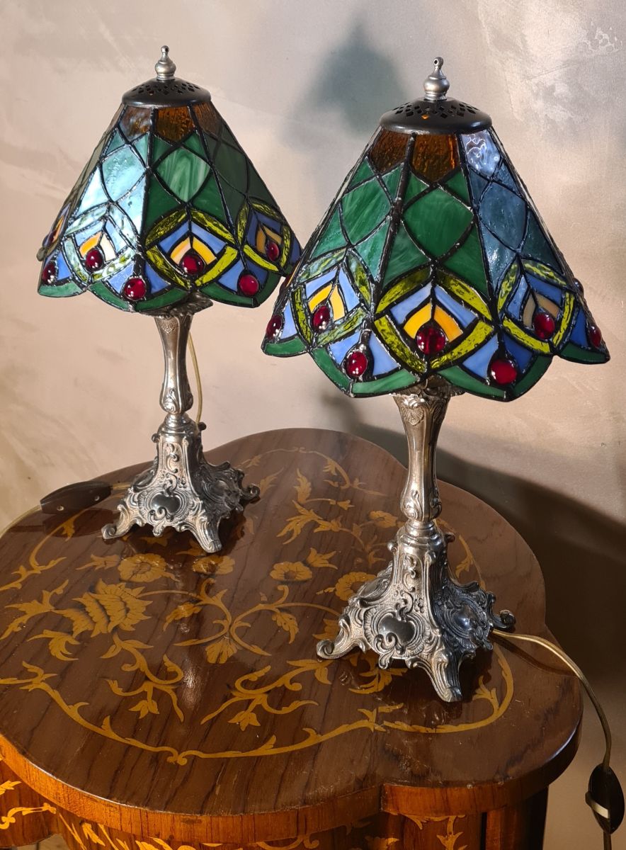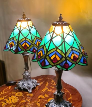 paire de lampe metal argenté art nouveau 38x20 tiffany verre paon