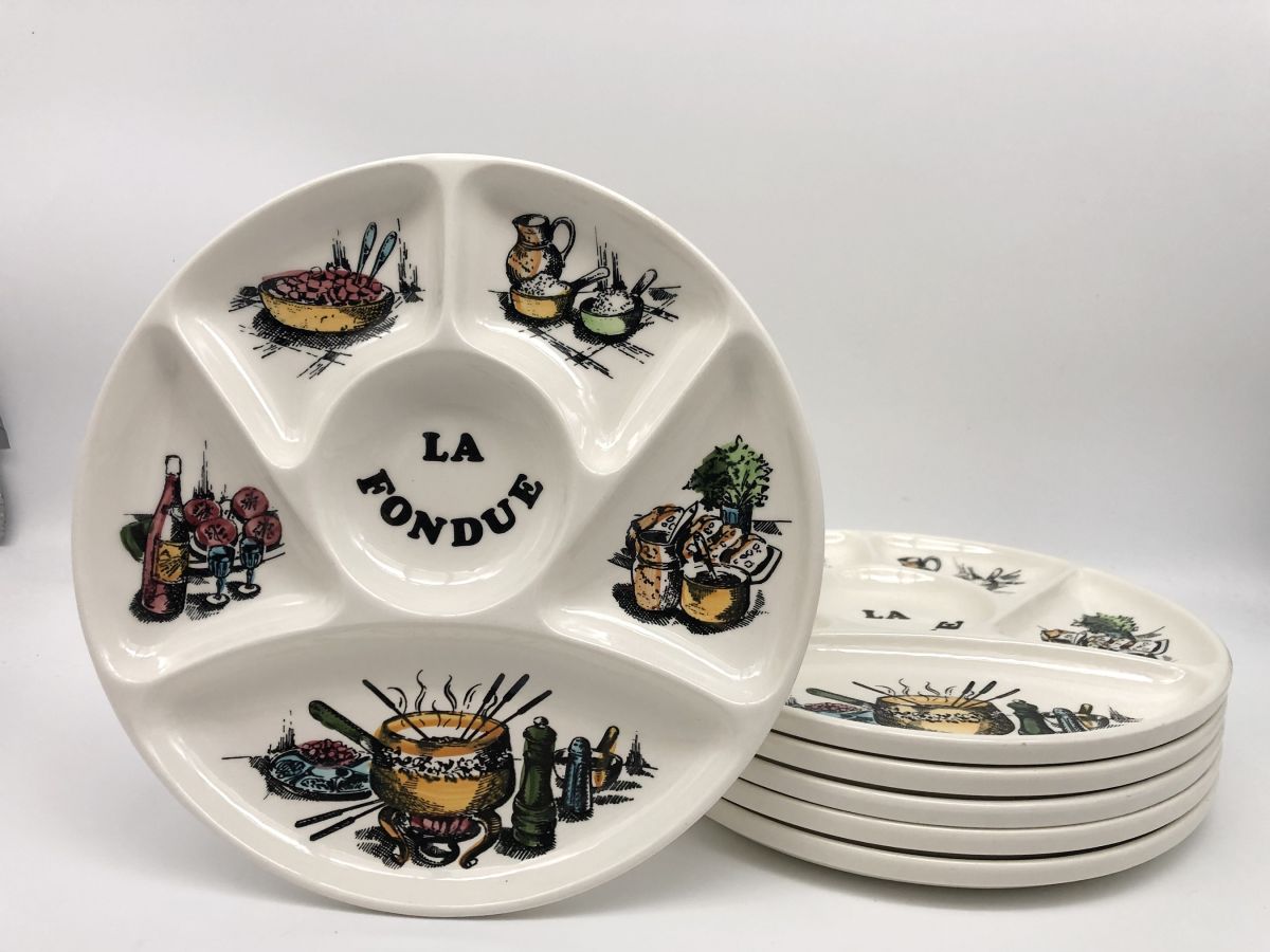 Ensemble de six belles assiettes à fondue Bourguignonne en céramique glacée.