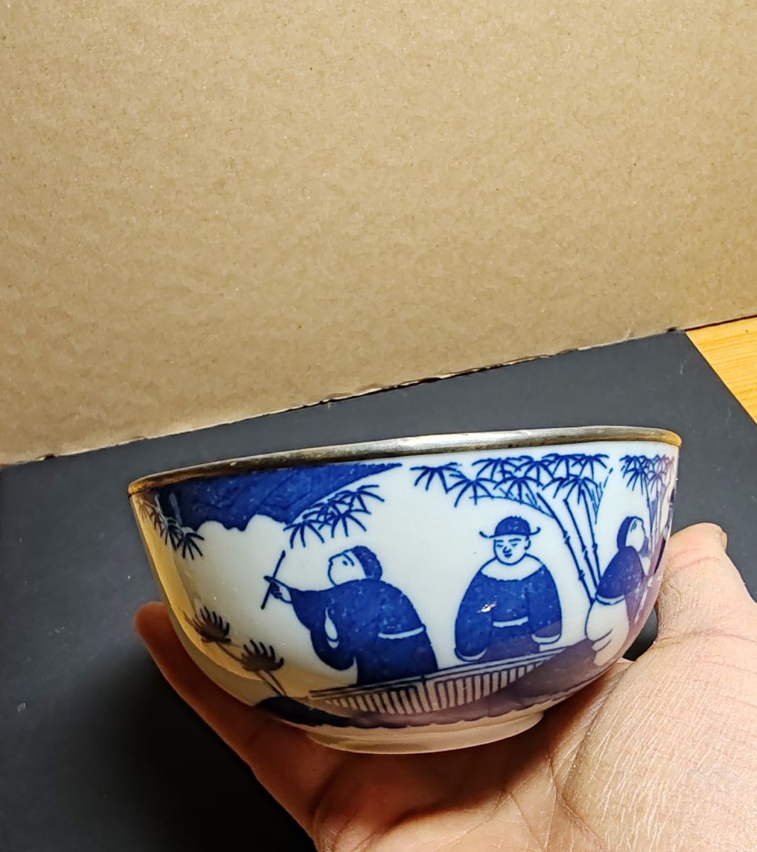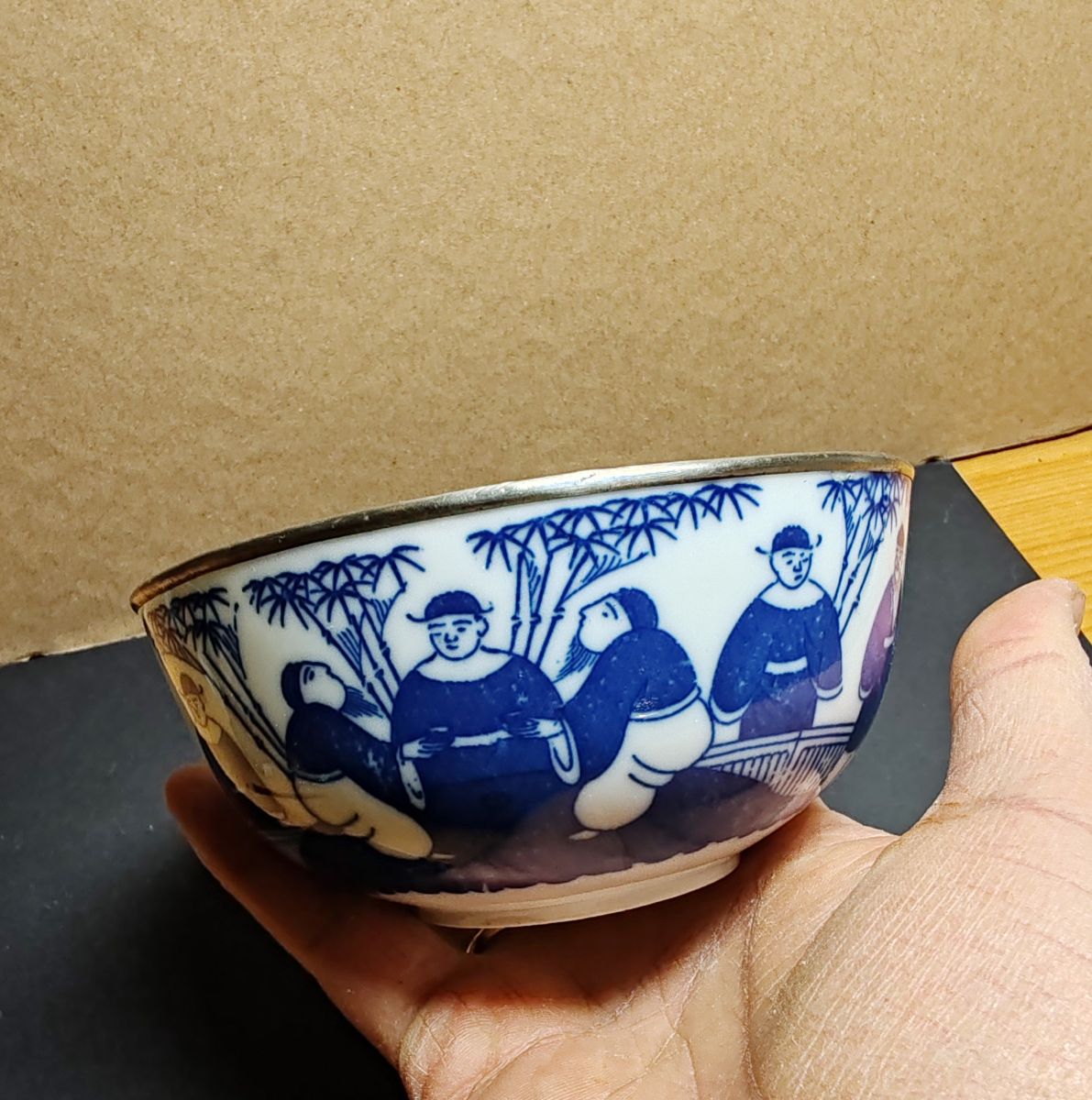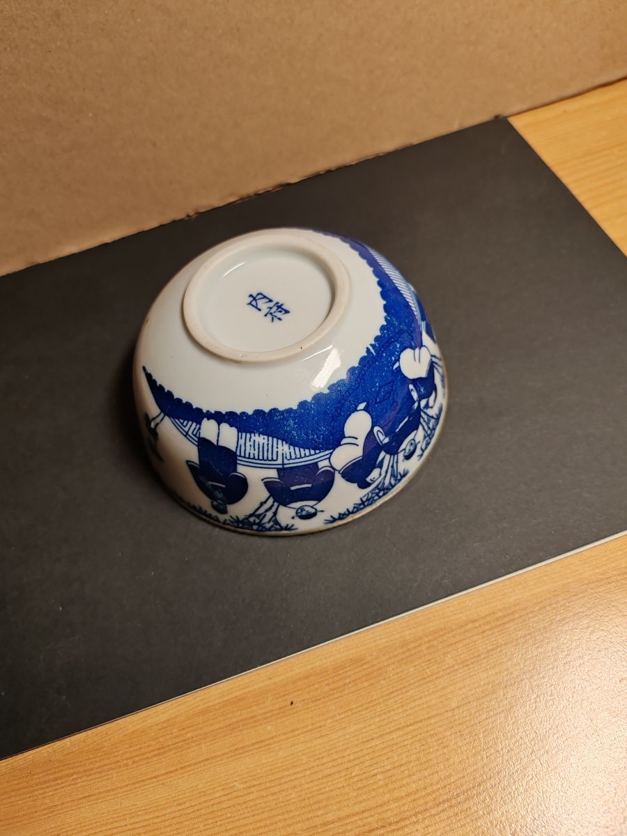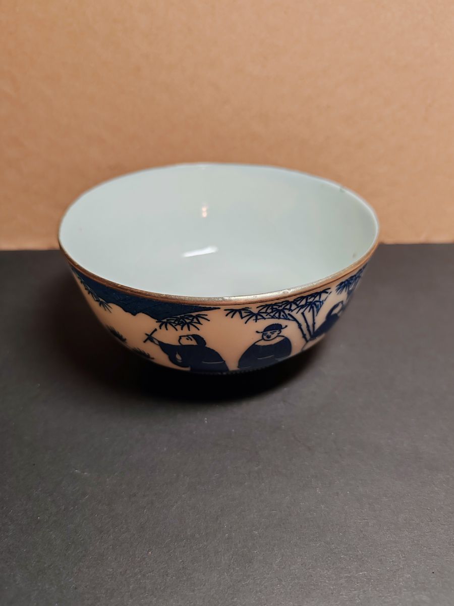 Marque : Magnifique bol en porcelaine du Vietnam du 19 ième siècle, bleu de Huê avec son cerclage en métal, un tout petit éclat a l' intérieur du bol est a signalé 12 x 6 cm pour 145 g