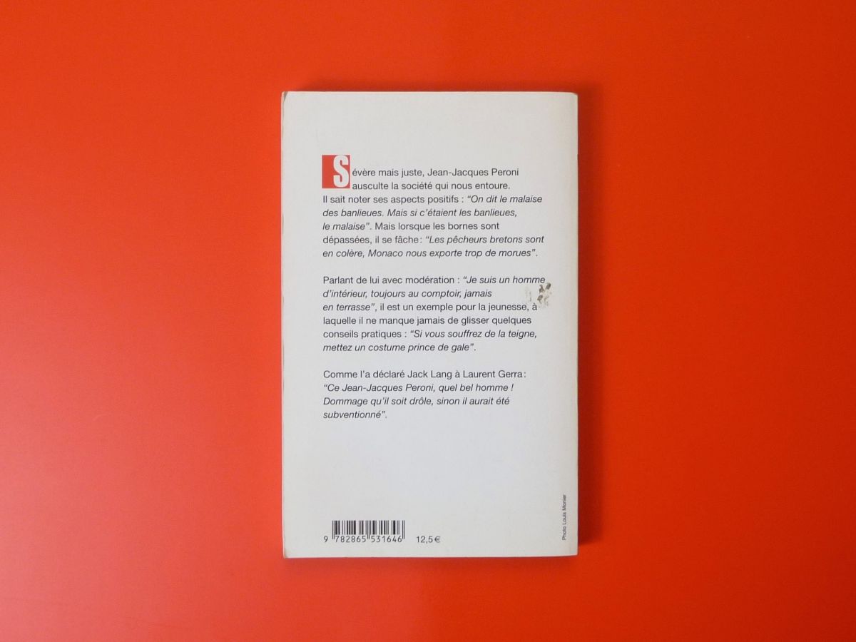 Sévère mais juste, Jean Jacques Peroni ausculte la société qui nous entoure. Il sait noter ses aspects positifs: "On dit le malaise des banlieues. Mais si c'étaient les banlieues, le malaise". Mais lorsque les bornes sont dépassées, il se fâche: "Les pêcheurs bretons sont en colère, Monaco nous exporte trop de morues".