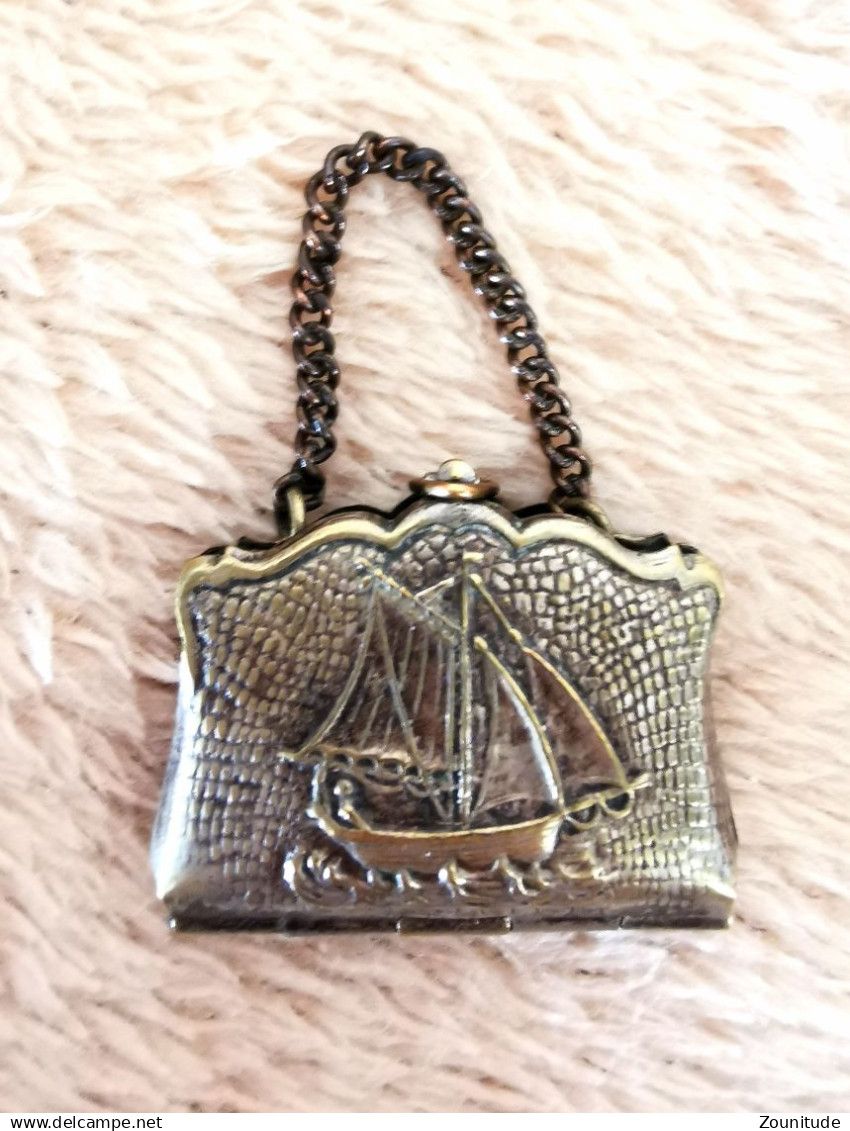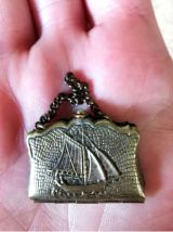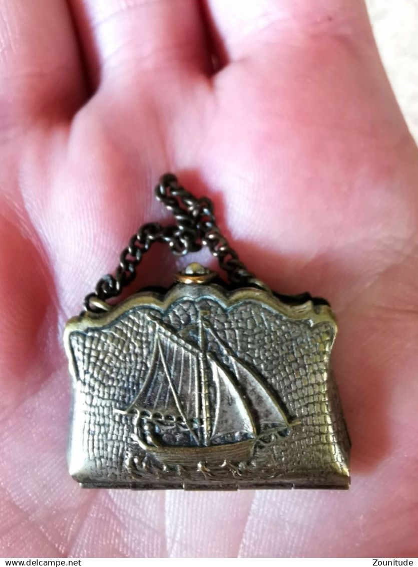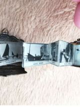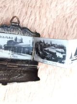 Petit médaillon souvenir en métal, datant du début du XXème siècle, représentant la ville de Berck-sur-Mer. Ce pendentif original est en forme de sac et comporte une gravure d'un bateau sur l'extérieur. Lorsqu'on l'ouvre, il révèle 8 mini-photos d'époque illustrant les paysages de la ville de Berck plage, offrant un aperçu fascinant de la
