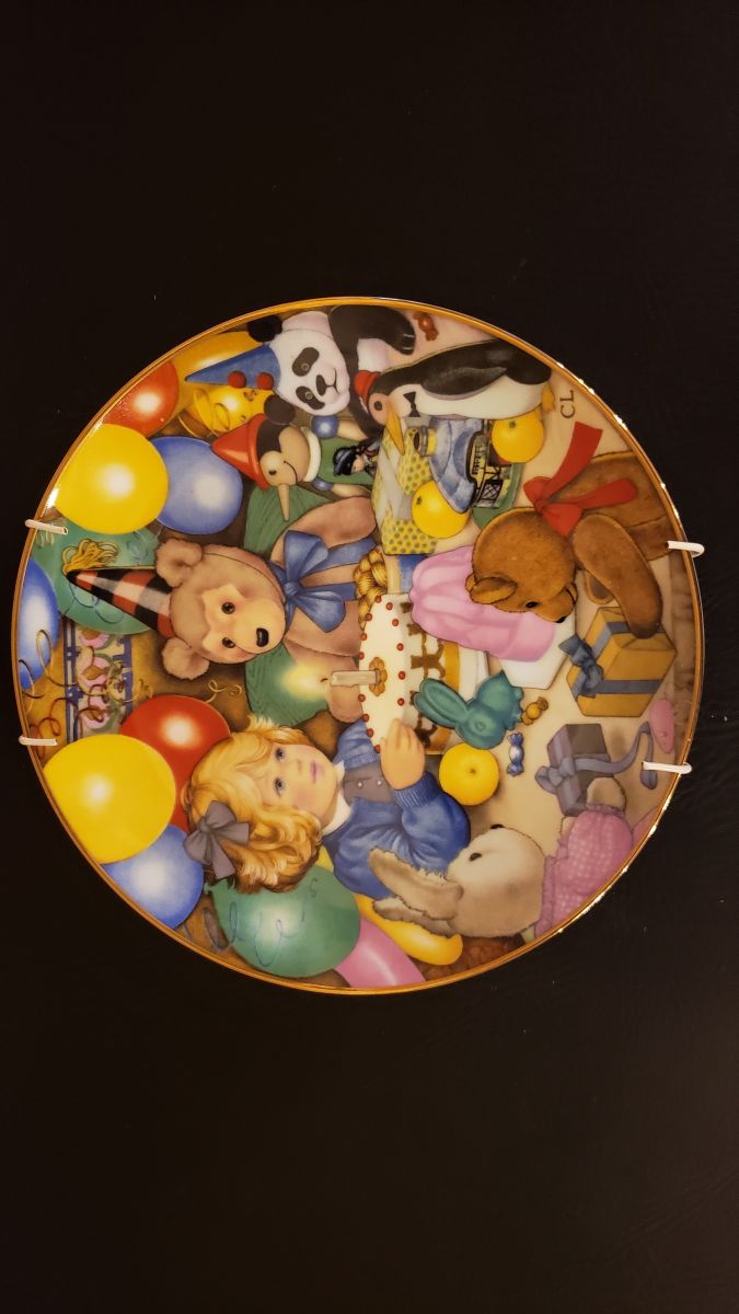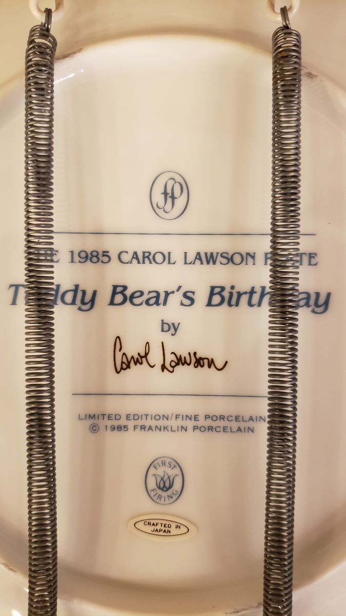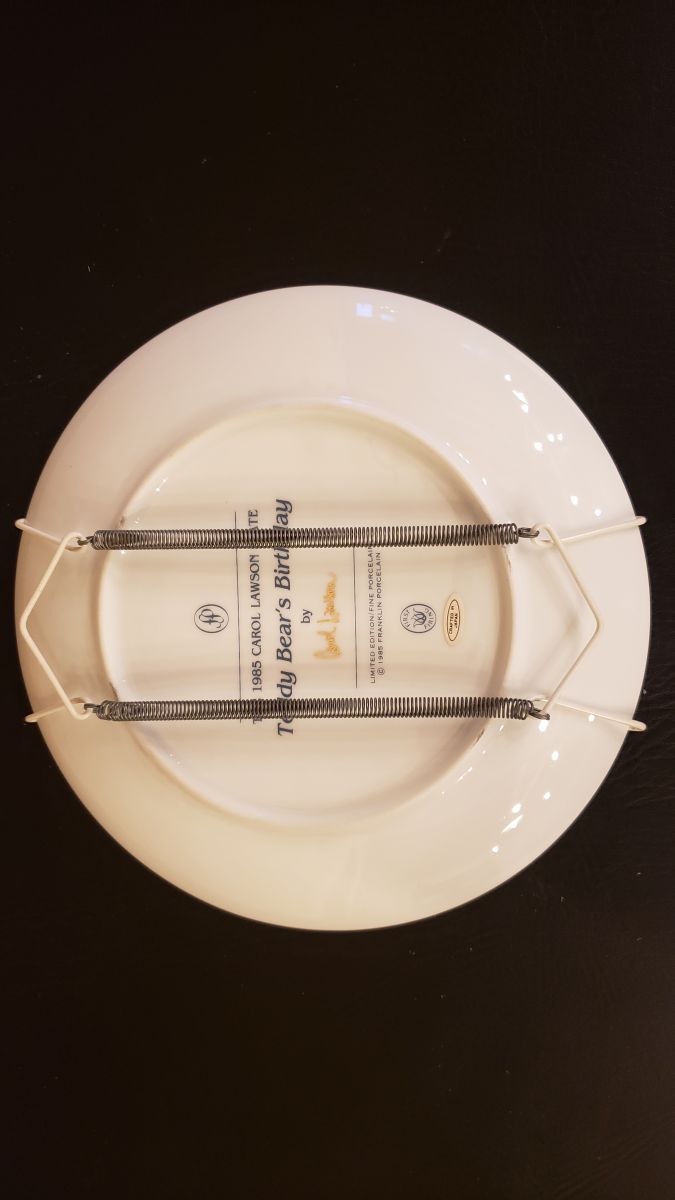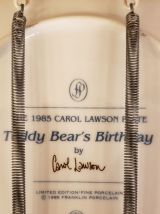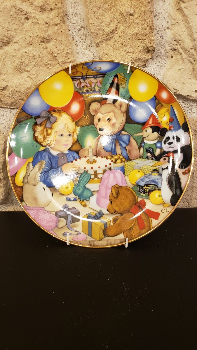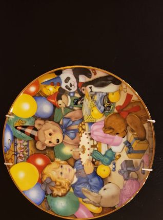Assiette en porcelaine "Teddy Bear's Birthday by Carol Lawson" sur son support mural.