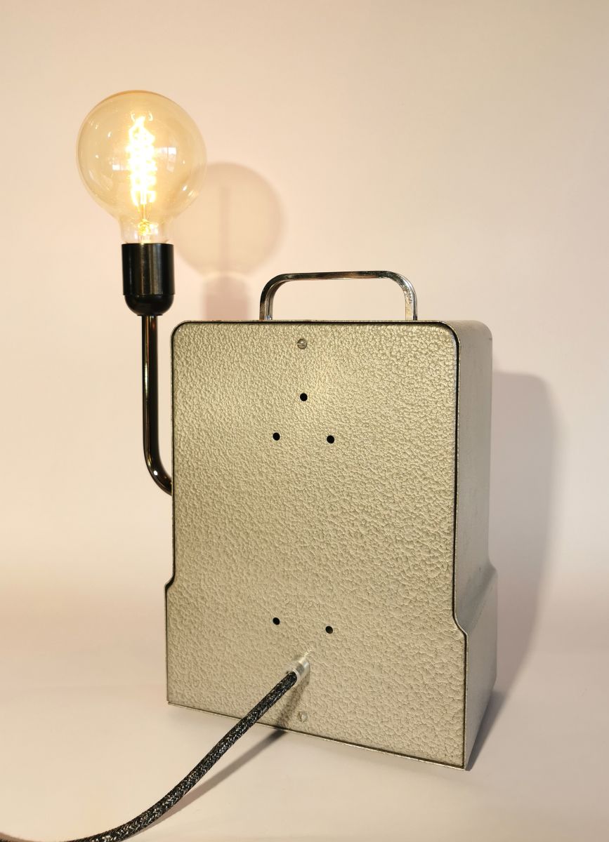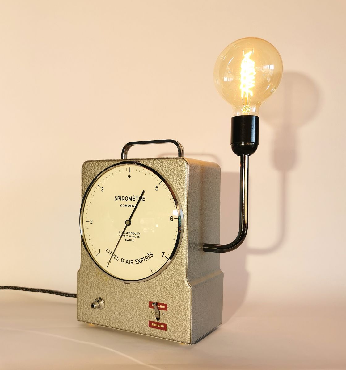 Cette lampe à poser unique est née d'un ancien appareil destiné à mesurer sa capacité pulmonaire : un spiromètre.