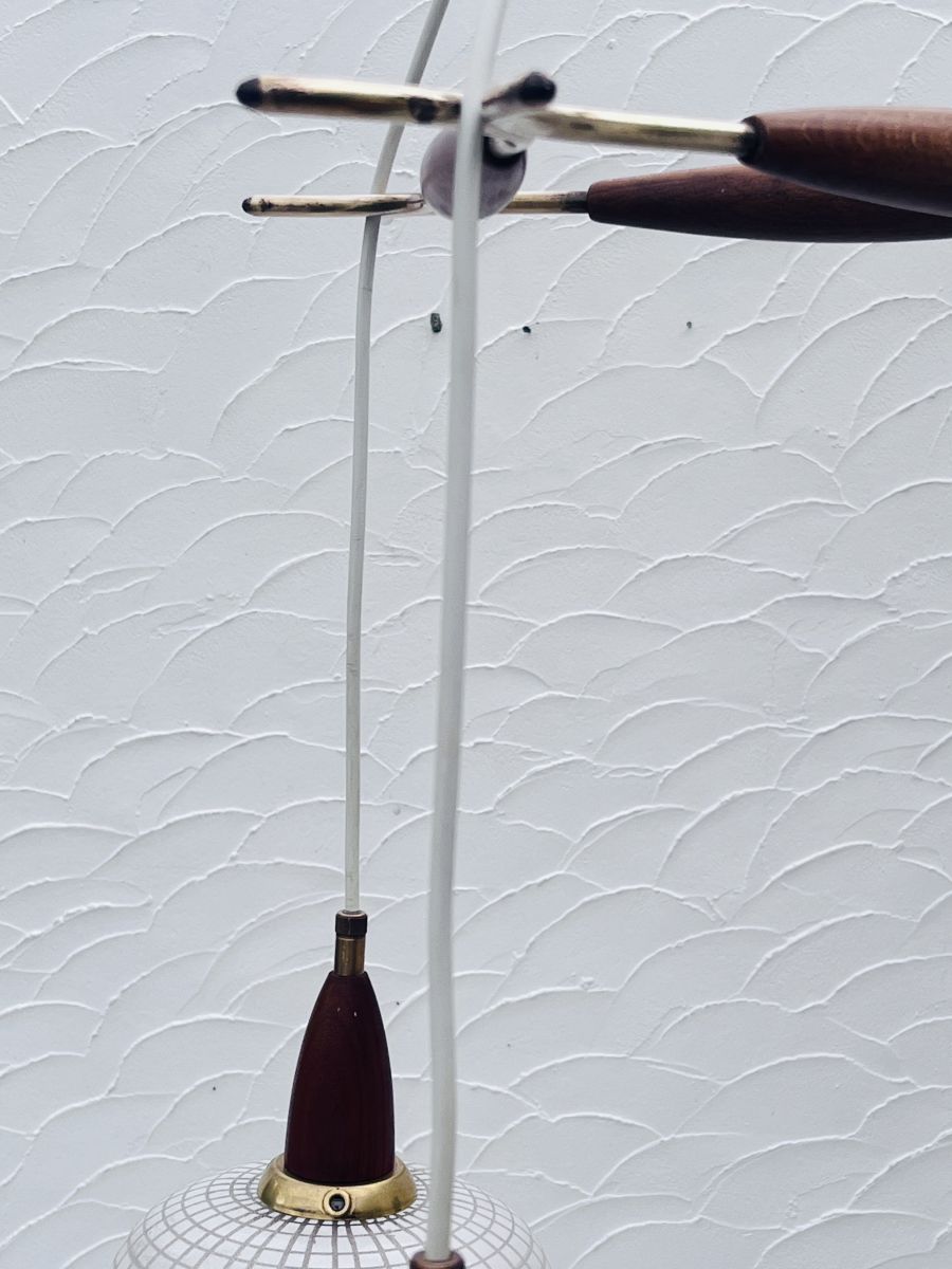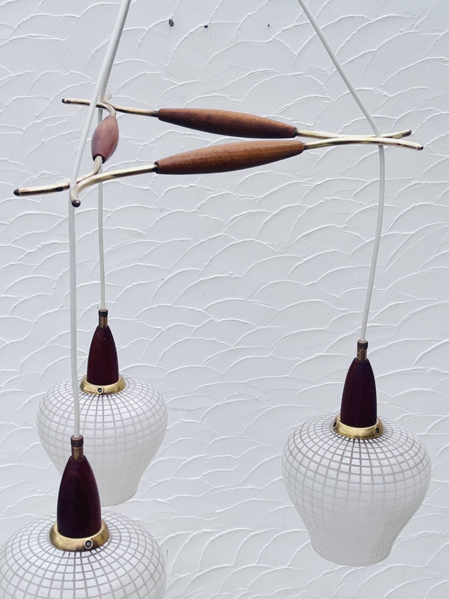 Superbe cascade scandinave Philips des années 60 , se compose de trois bobèches en forme de tulipe avec un décor sablé blanc et d'une finition en bois de teck.