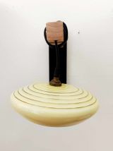 Globe en opaline vintage monté en applique. Globe de forme dite ovni de couleur jaune pale avec rehauts de dorure (usure à la dorure) monté en applique sur un support bois et métal moderne.