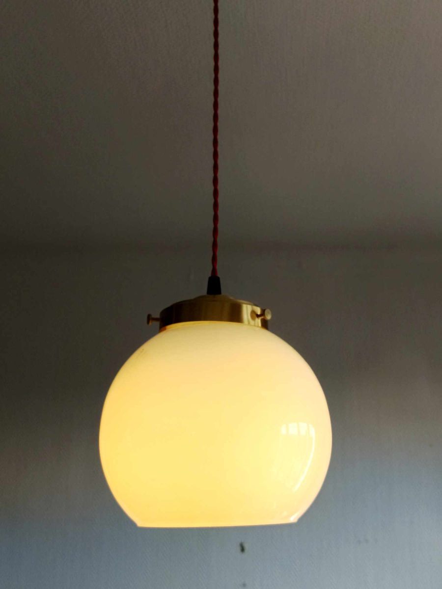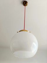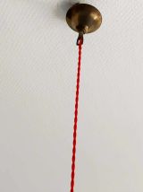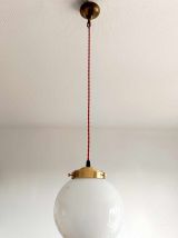 Suspension composée d'un globe rond ouvert en opaline blanche avec monture en métal dorée à trois griffes, fil électrique en tissu torsadé rouge neuf et pavillon en métal doré vintage.