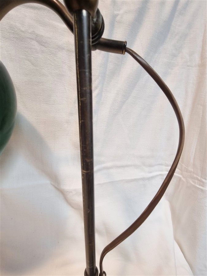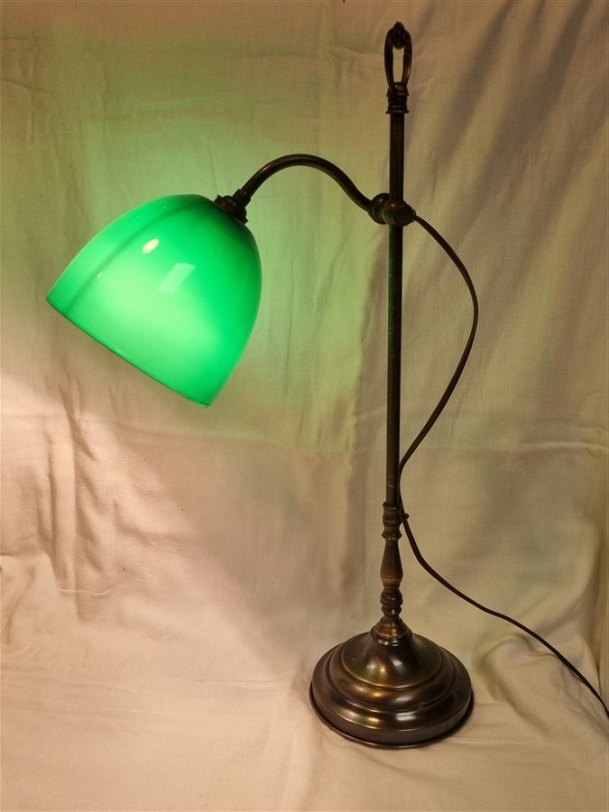 Lampe col de cygne avec opaline verte, en laiton patiné. Son bras est réglable en hauteur et l’opaline est orientable. Le laiton porte quelques traces liées au temps, l’opaline verte est en très bon état.