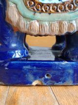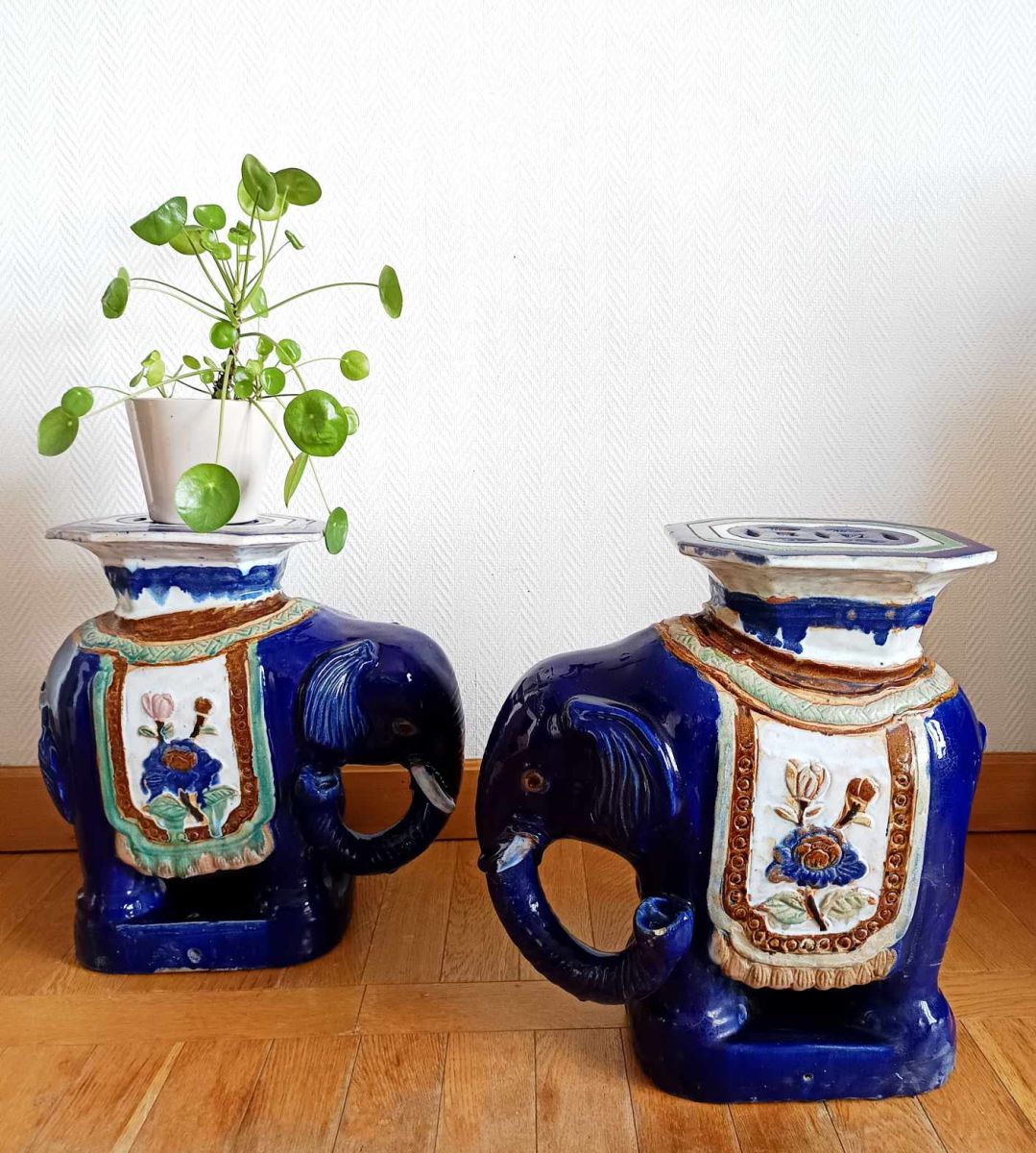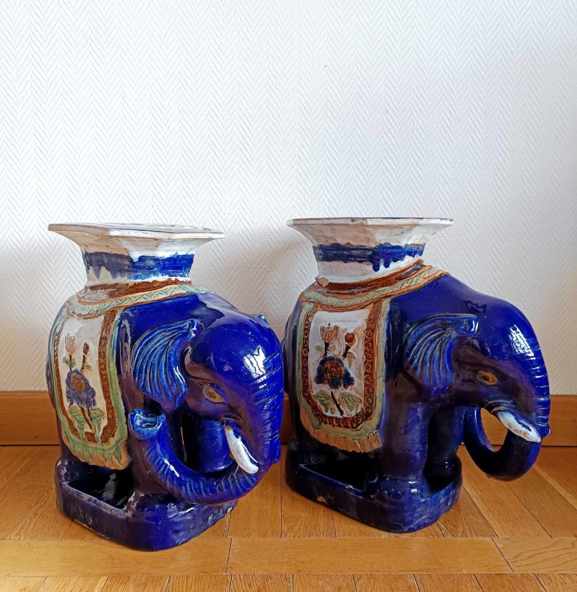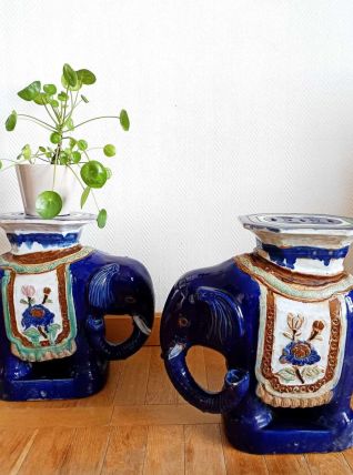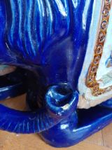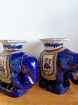 Tabourets ou tables d'appoint en céramique vernissée bleu nuit et polychrome représentant un éléphant caparaçonné avec un siège sur le dos.