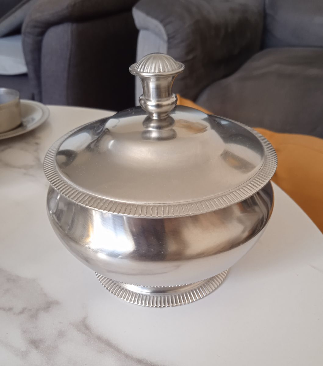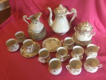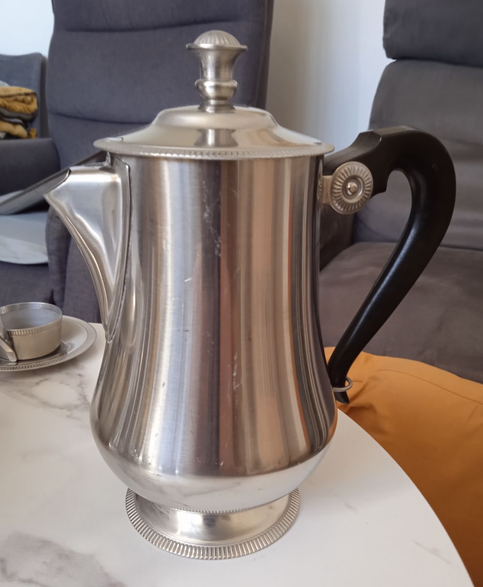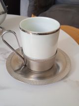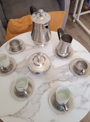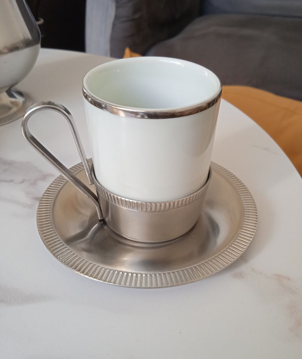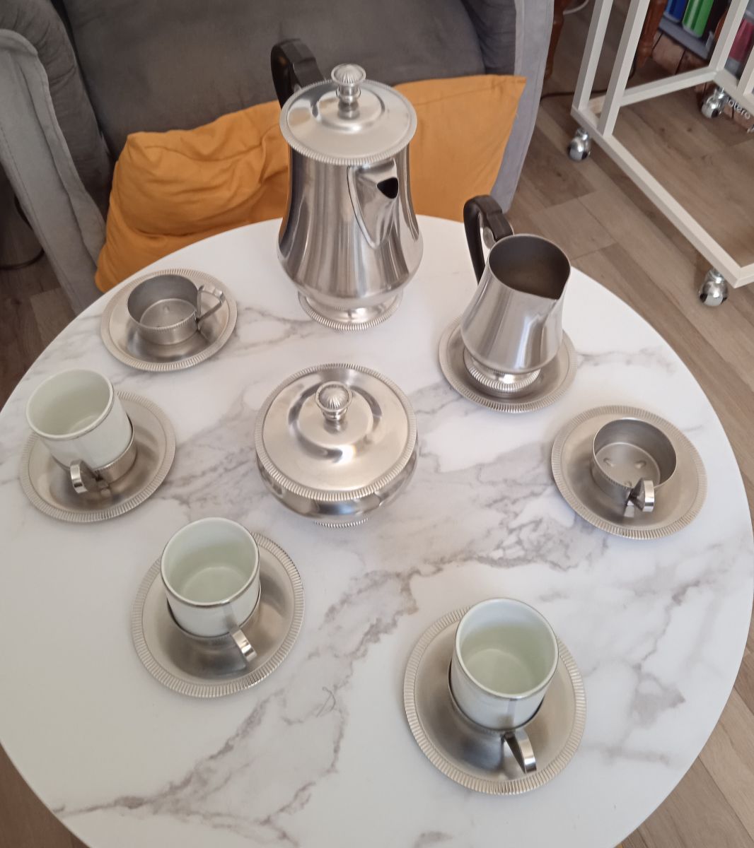 Cafetière + pot à lait + sucrier + 3 tasses complètes (tasse en porcelaine + porte tasse en inox +sous tasse en inox) + 2 portes tasses en inox + 3 sous tasses en inox